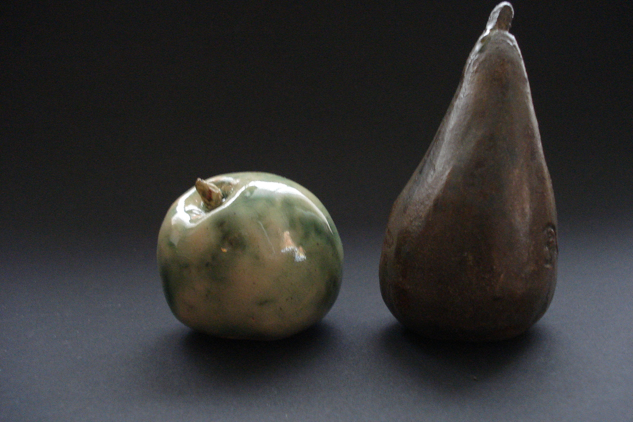 appel van porselein met een vleugje koper glazuur peer van zwart bakkende klei zinder chamotte met een vleugje koper glazuur