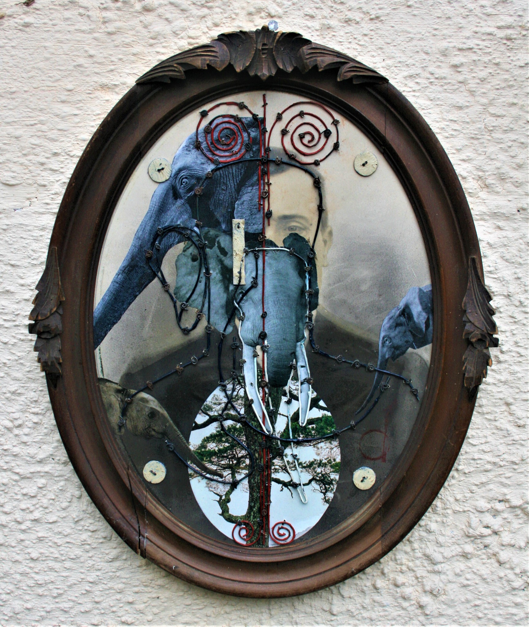 Antieke foto in originele lijst, bewerkt, ijzerdraad, acryl, collage