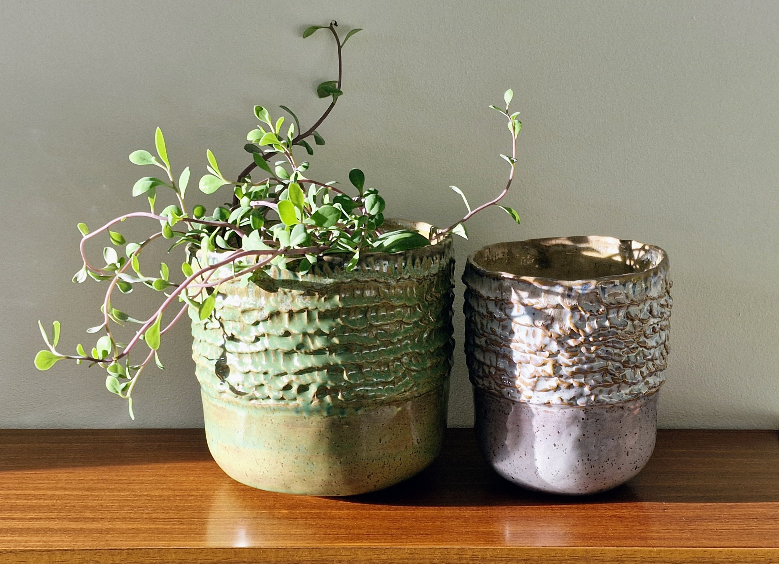 Een handgevormde bloempot van steengoed in een prachtige groene kleur.