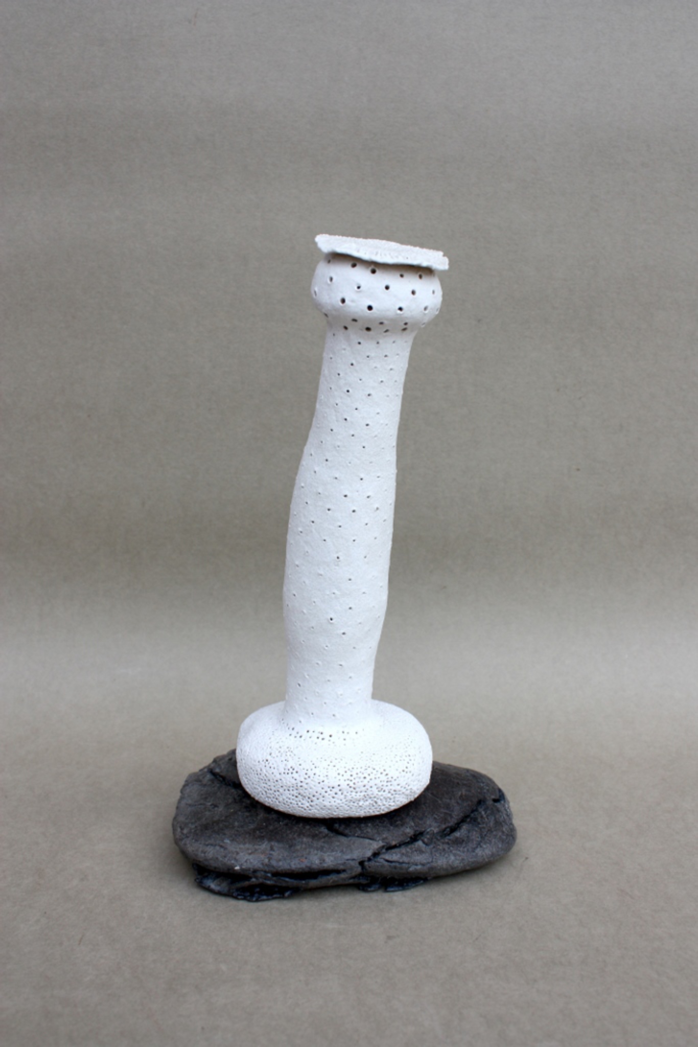 Techniek: Steengoed met porselein-structuur-huid gestookt op 1220 graden C. Gemonteerd op gejut hout.