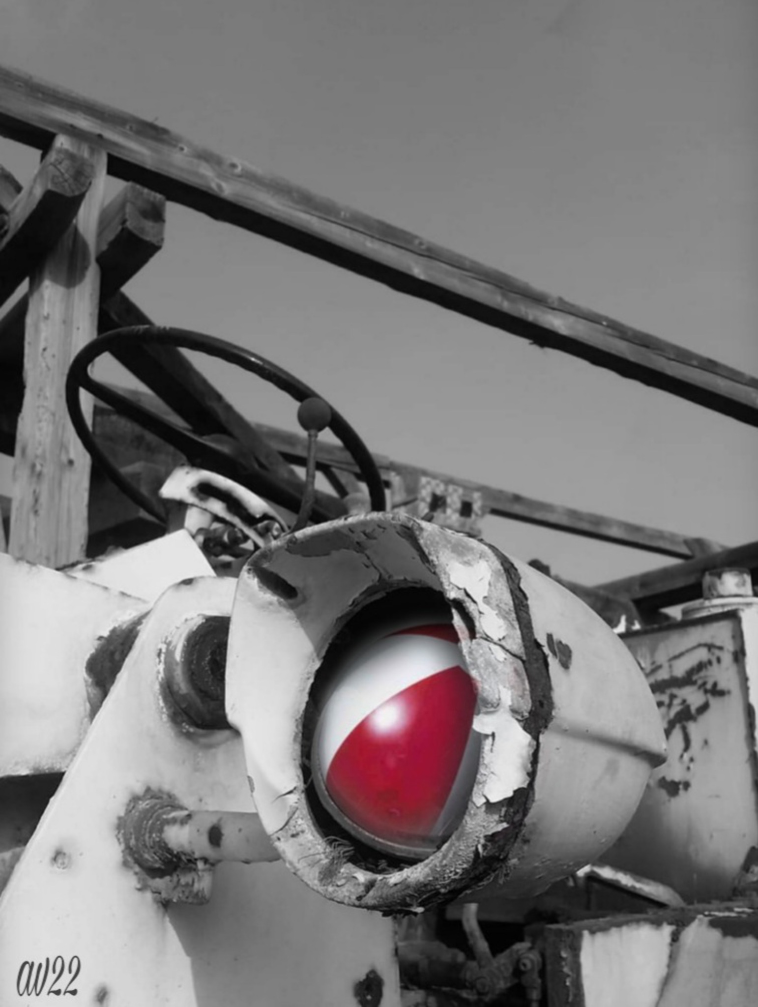 Digital art. Fotobewerking, waarbij een strandbal verstopt zit in de koplamp van een tractor.