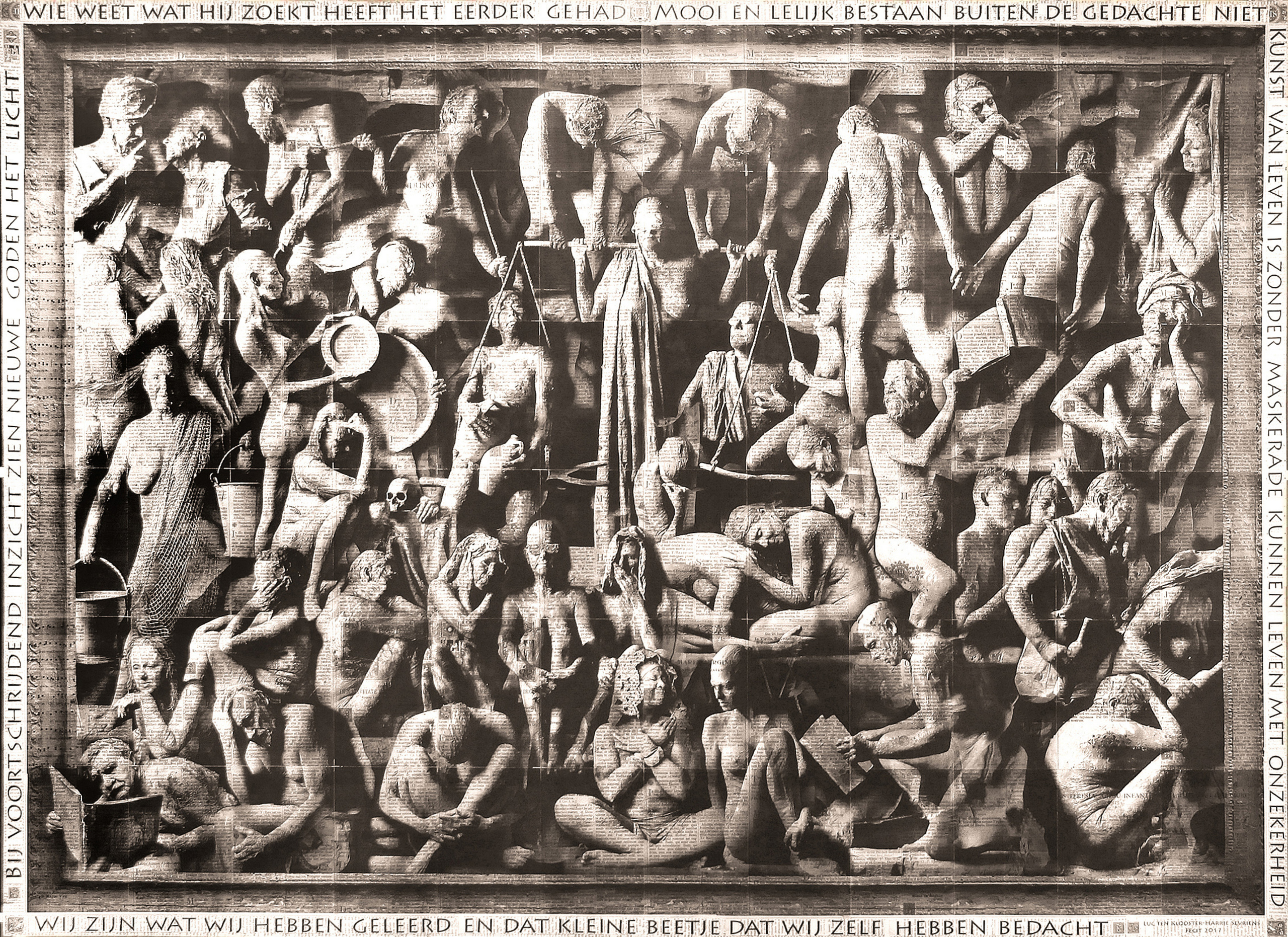 Derde deel van 'Ecce Homo', een 10m breed vierluik in de vorm van grote papierbanieren. De teksten zijn van de in 2018 overleden Heerlense dichter en aforist Harrie Sevriens. De modellen, bedekt met leem, zijn apart gefotografeerd waarna het totale beeld werd samengesteld en geprint op in totaal 400 bladzijden papier van een oud katholiek misboek.
