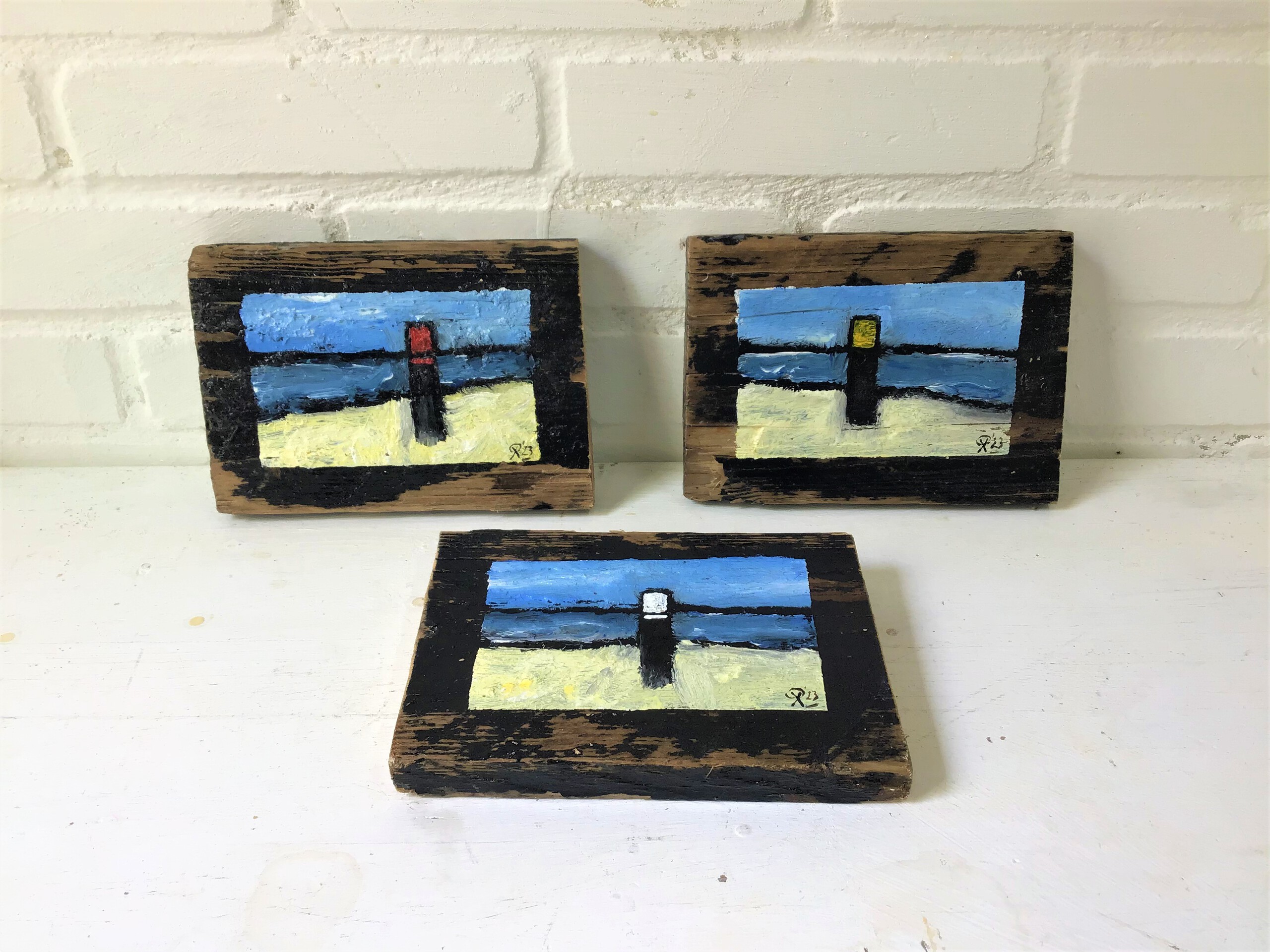 Drieluik Texelse strandpalen. 12 x 16 x 2 cm.