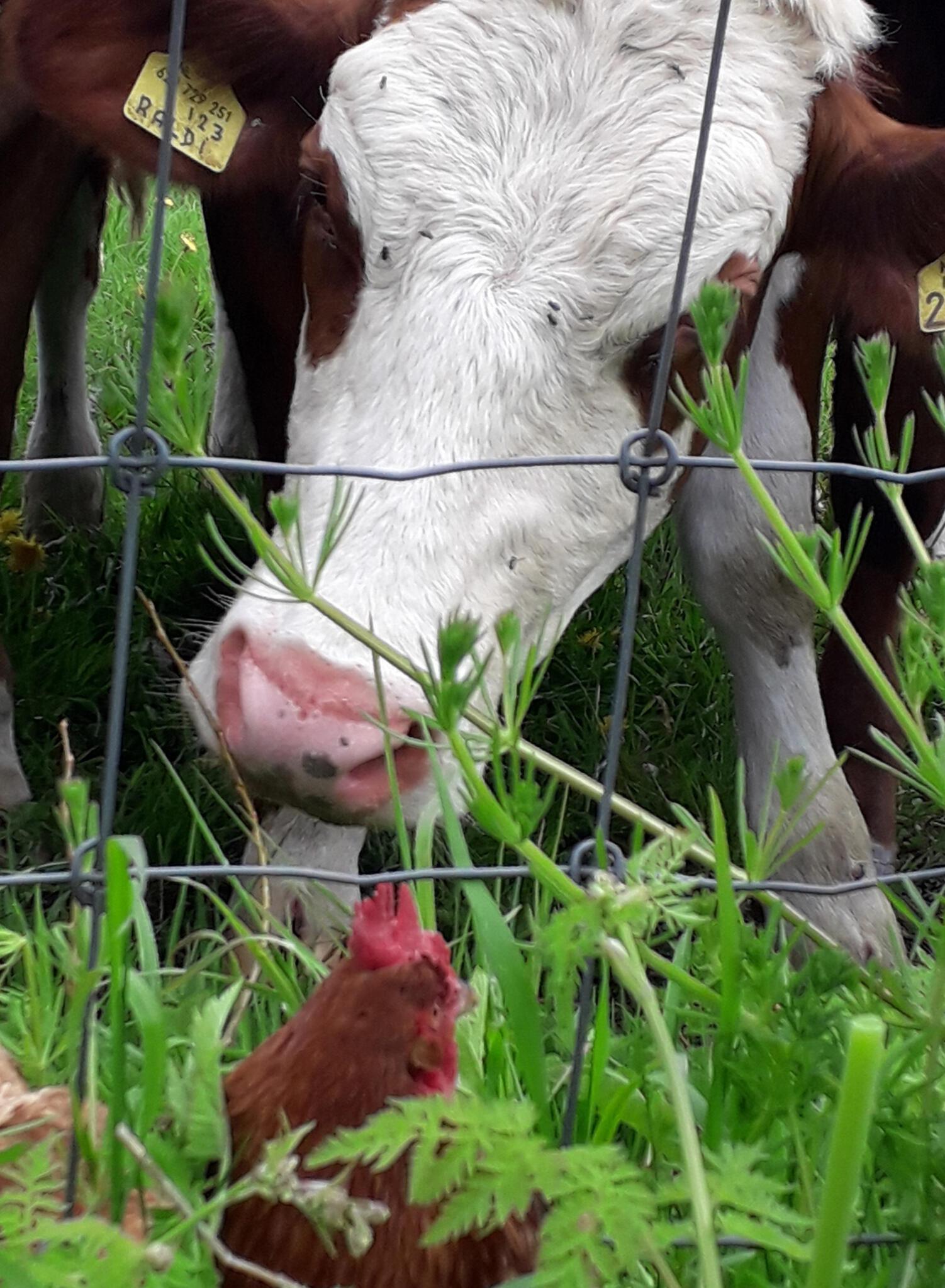kip in paniek.... en een nieuwsgierige koe
