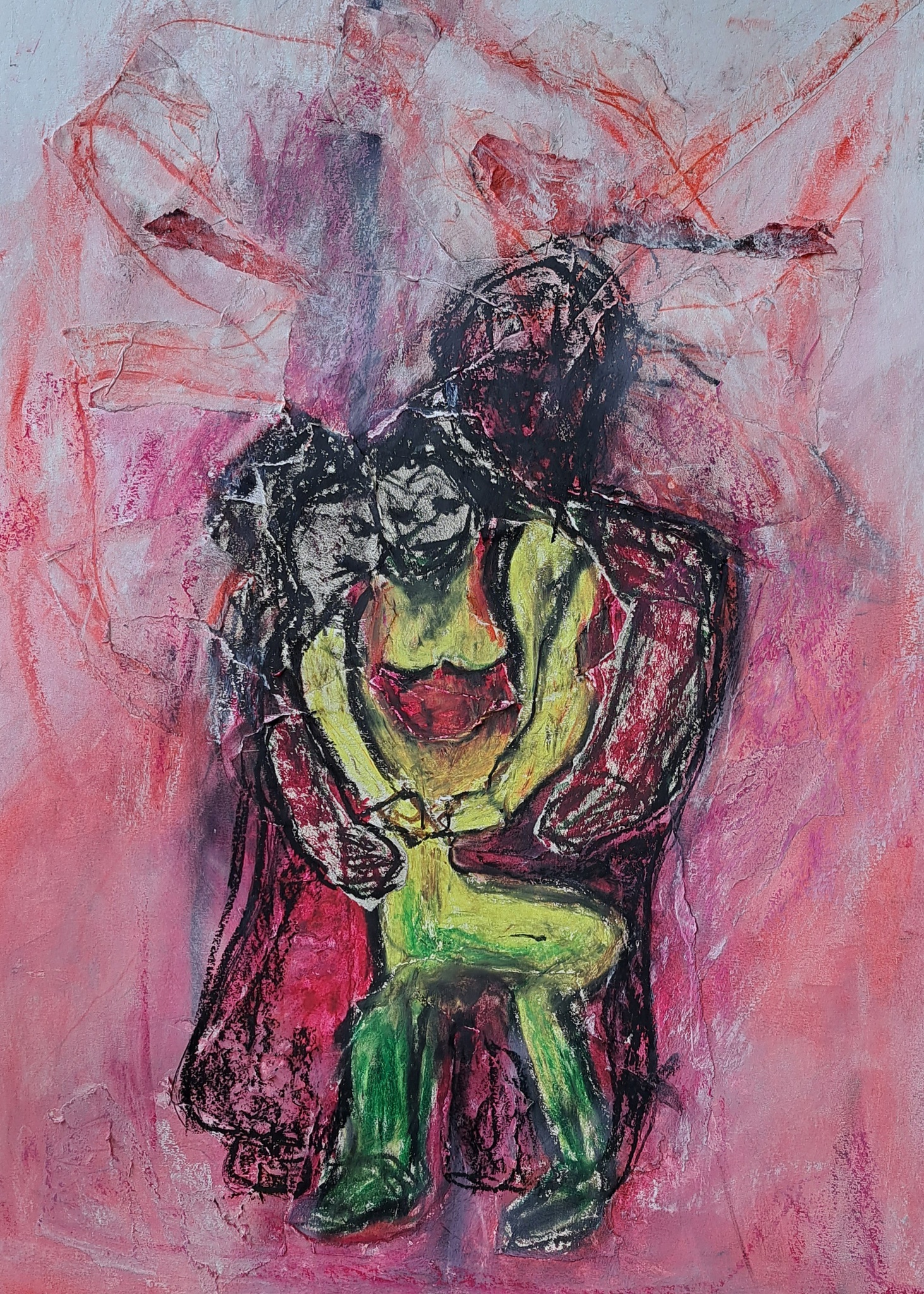 Moeder - kind relatie. Collage, acrylverf en olieverf op acrylpapier