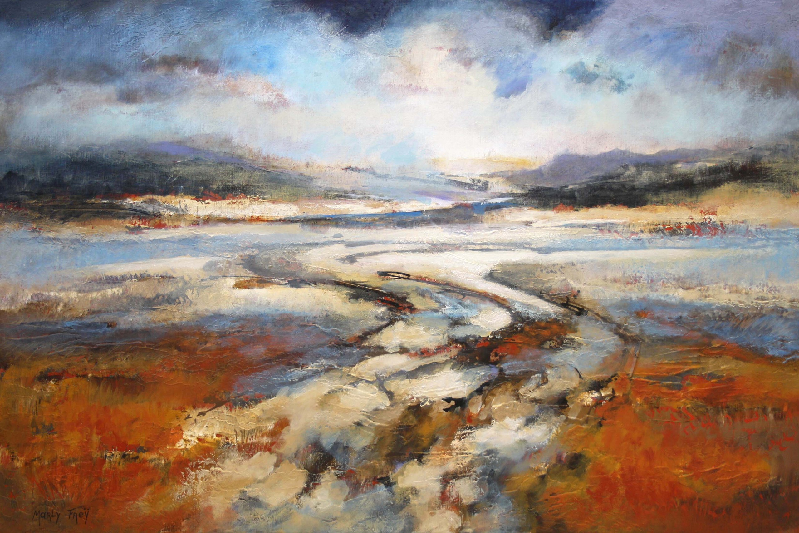 Marly Freij maakt grote kleurrijke, maar ook meer ingetogen schilderijen in gemengde techniek, met name sferische landschappen en abstracte composities