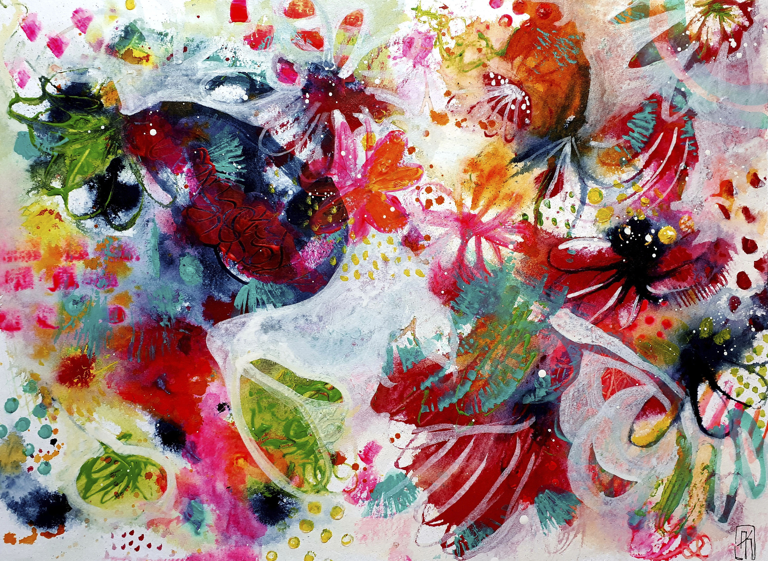 Dit is ook een spontaan werkje van kleurtje hier, kwastje daar en dan vormt er soms iets op papier waar je helemaal niet aan gedacht had. Ik vond een 'Orff' in mijn werkje. Hij zat omringt door bijen onder het stuifmeel van de bloemen.