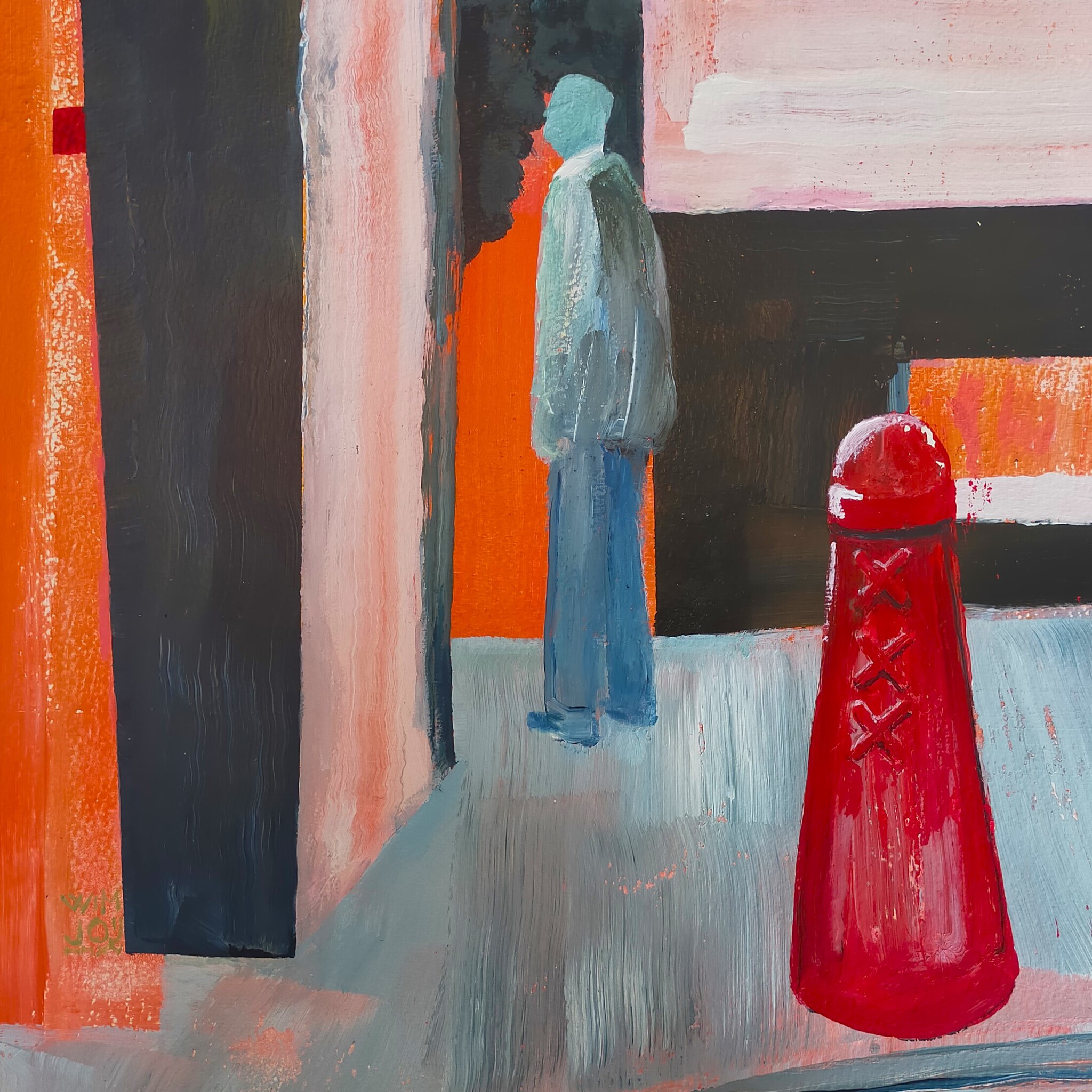 Acryl op papier, ingelijst. Het werk is zelf 40 x 40 cm, inclusief paspartout en lijst 55 x 55 cm.