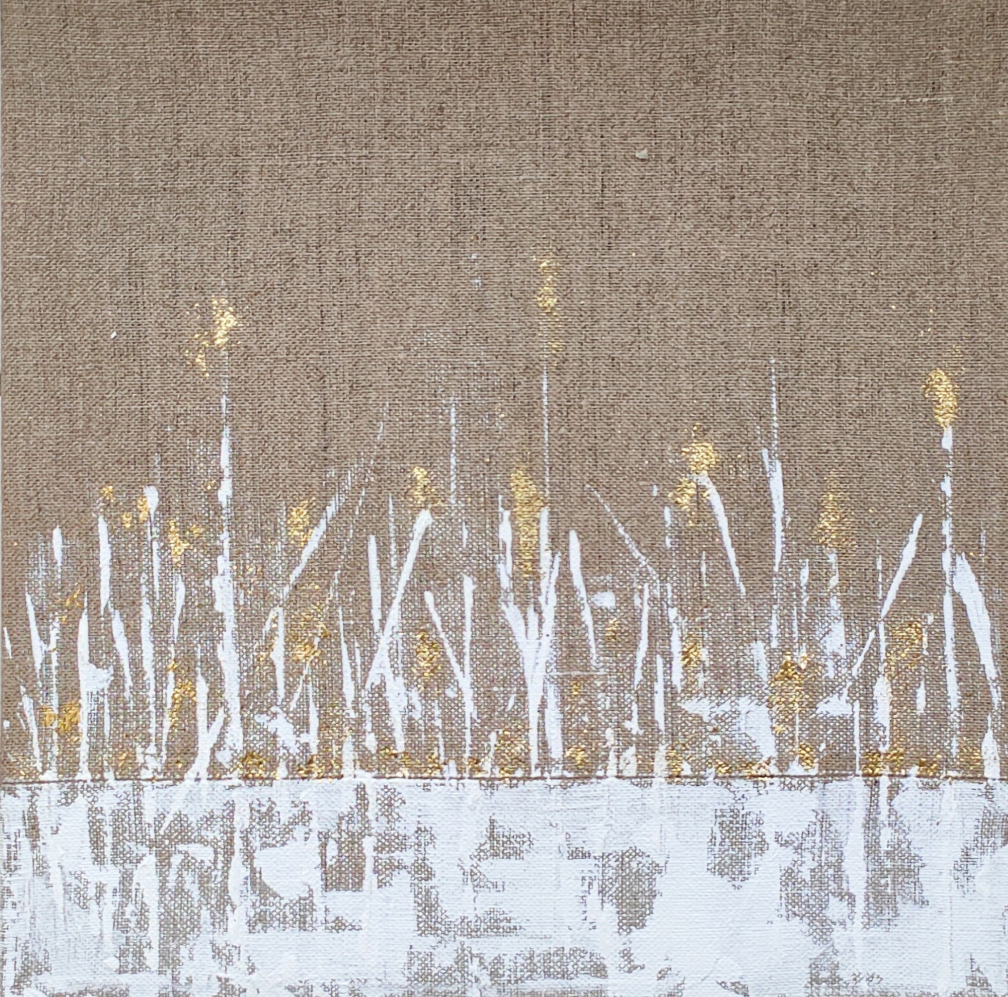Rietstengels in wit en goud, geschilderd op onbewerkt linnen, hierin is een naad verwerkt In witte houten baklijst