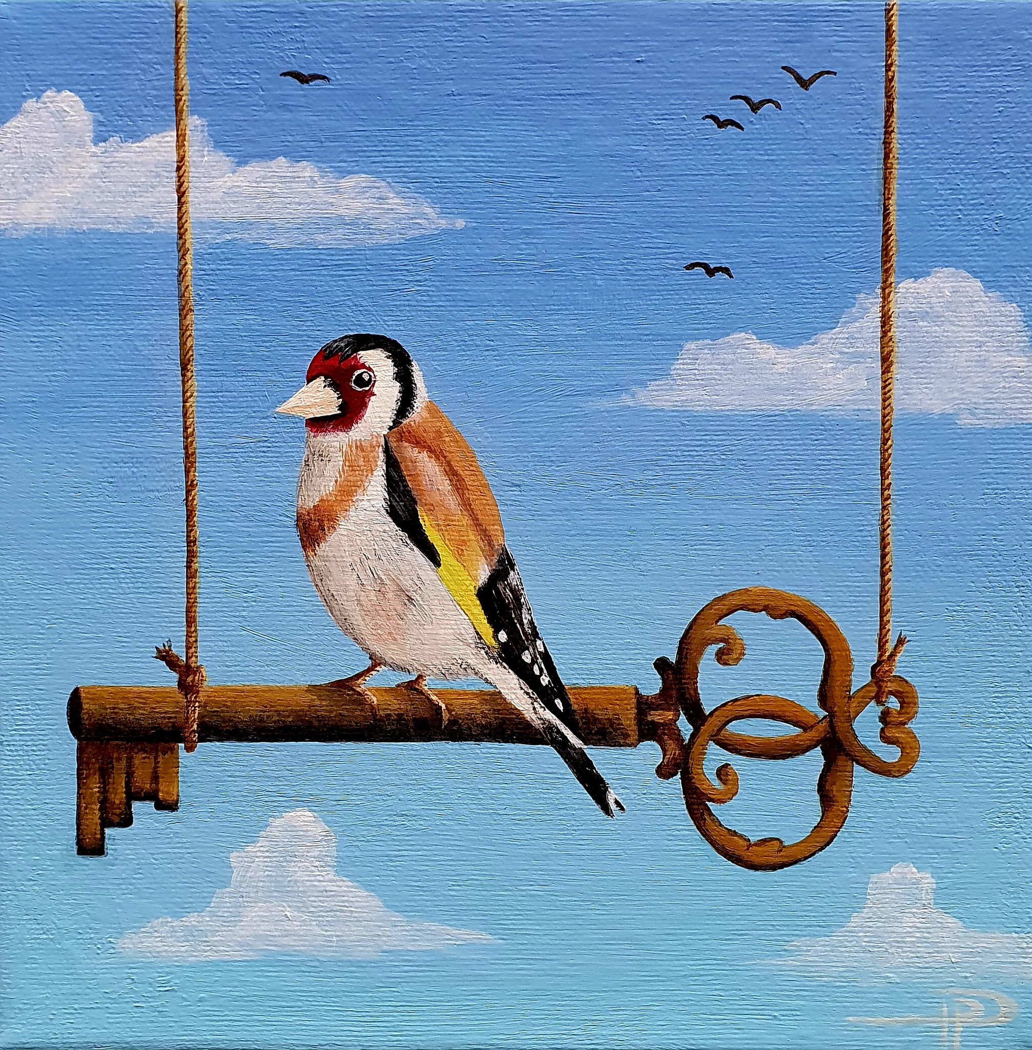 Het puttertje, zoals door Fabritius geschilderd, was de inspiratie voor dit schilderij. Ik beeld het puttertje hier af als vrije vogel op een sleuteltje. Johannes 8:36 Als u door de Zoon van God wordt bevrijd, zult u werkelijk vrij zijn.