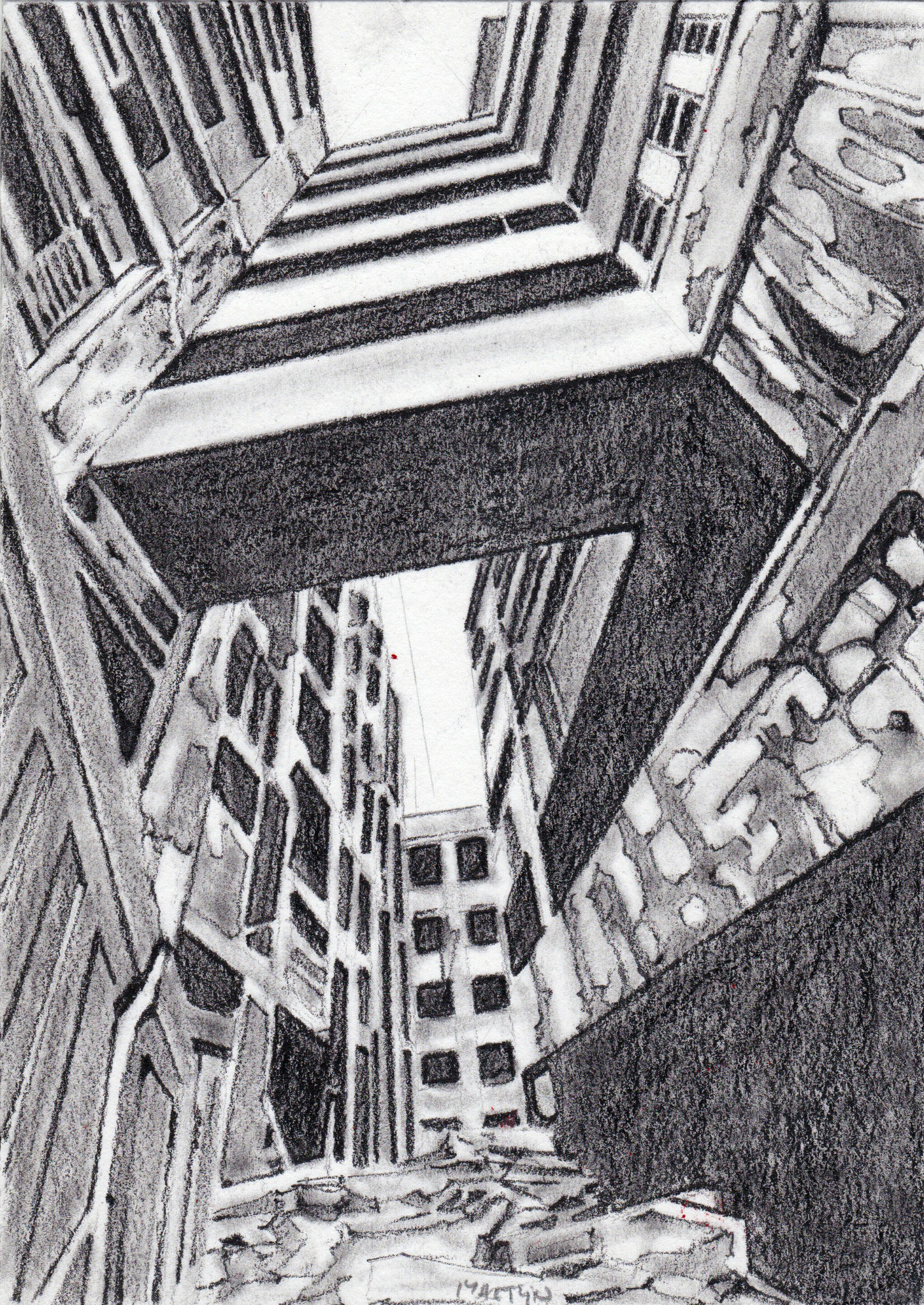 Fragment van het als stad bebouwde eiland Hashima voor de kust van Japan. Dit eiland was eigendom van Mitsubishi die er een onderzeese mijn wilde ontwikkelen, en is voor een periode de meest dichtbevolkte plek op aarde geweest. Sind in 1974 de mijnen gesloten werden is dit eiland onbewoond. Het verkreeg later enige bekendheid doordat het een locatie was in de James Bond film Skyfall.
