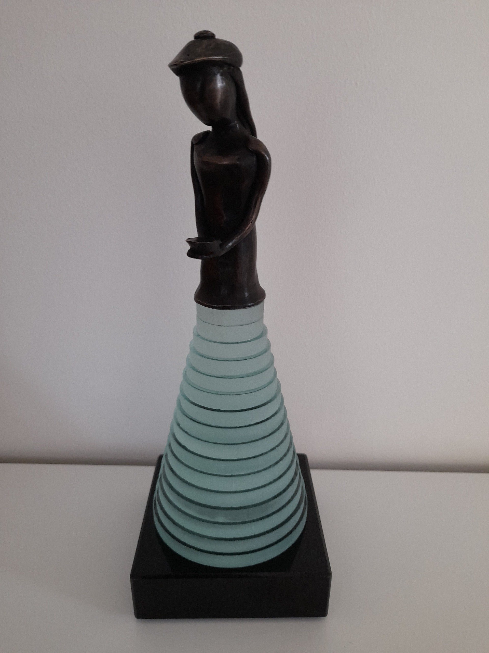 Brons gemaakt volgens de verloren wastechniek. Glas 8 mm dik gesneden door waterstraal