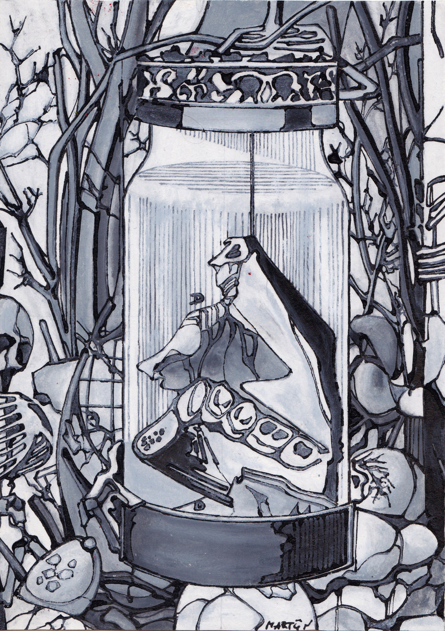 Tekening gebaseerd op een preparaat van de Nederlandse anatoom, zoöloog en botanicus Frederik Ruysch (1638 - 1731). Hij presenteerde zijn preparaten net als de anatomische tekeningen van Andreas Vesalius/ Jan Steven Kalkar als kunstwerken of lugubere composities, waardoor het onderscheid tussen kunst en wetenschap vervaagde.