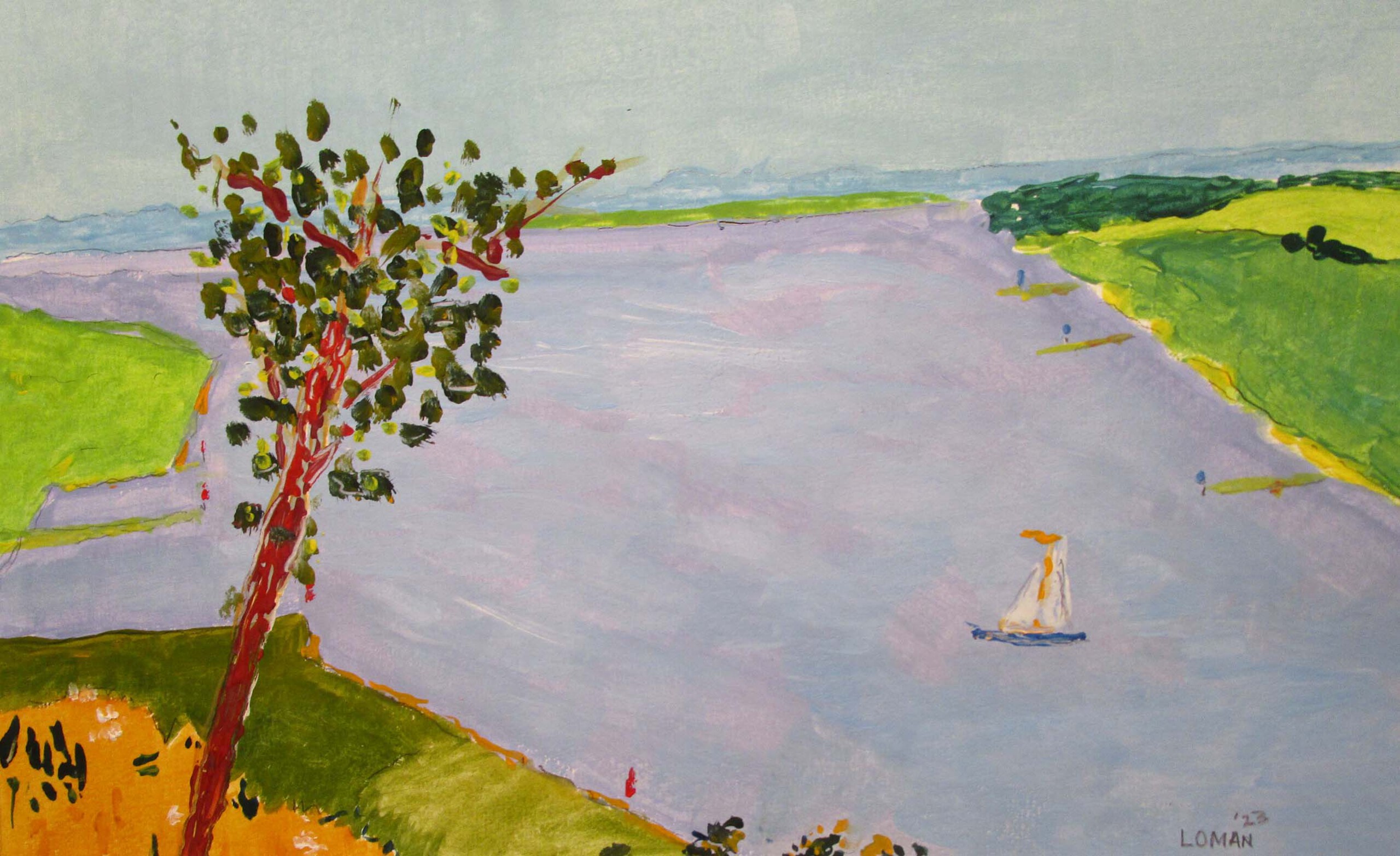Rivier Oevers Bakens Boom Zeilboot Lucht Water Blauw Groen Geel Rood