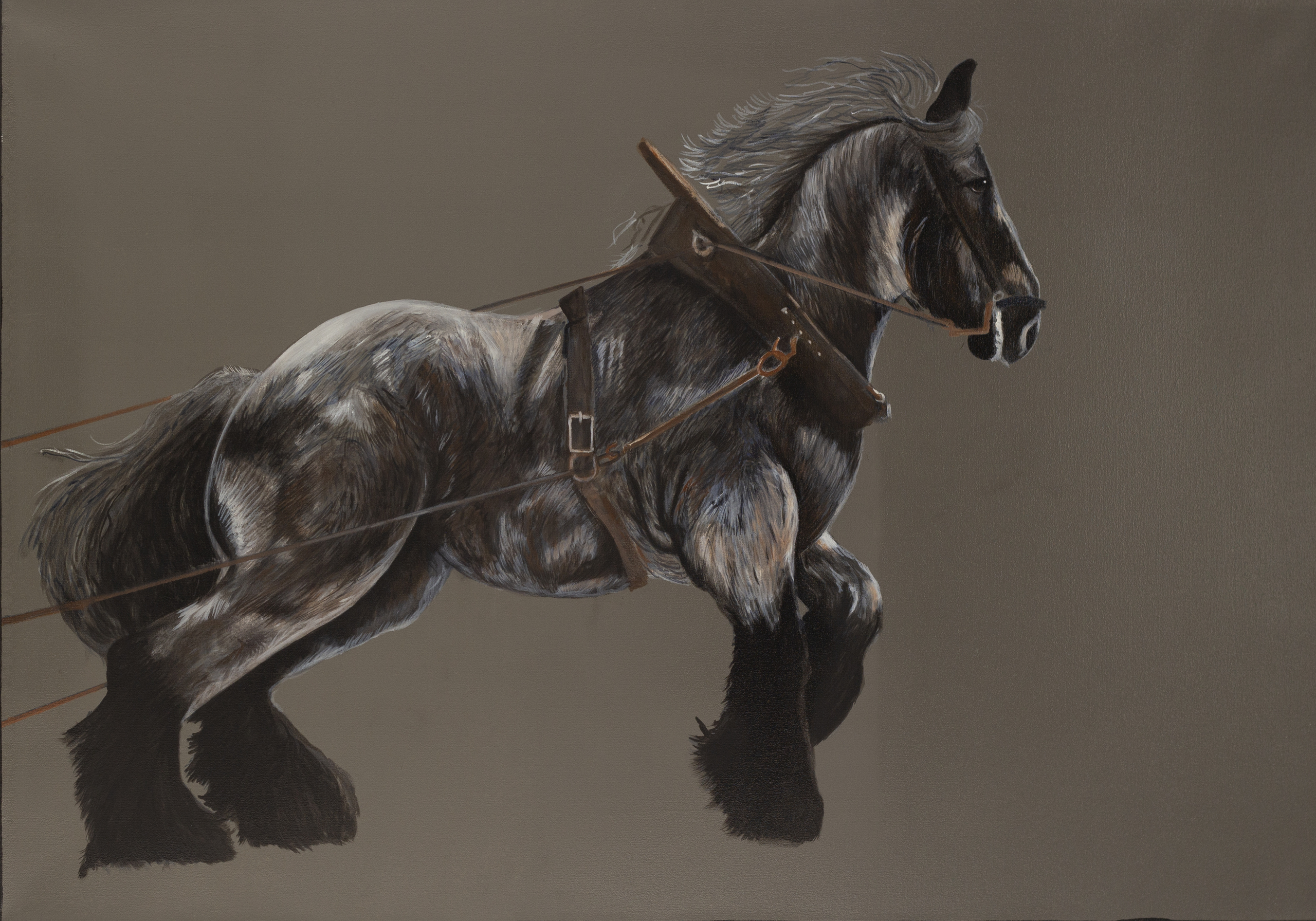 Een trekpaard dat deelneemt aan een powerhorse onderdeel. Gewicht trekken op een slee. Iedere stap wordt het gewicht verhoogd, de laatste die overblijft heeft gewonnen. Geschilderd met olieverf op linnen.