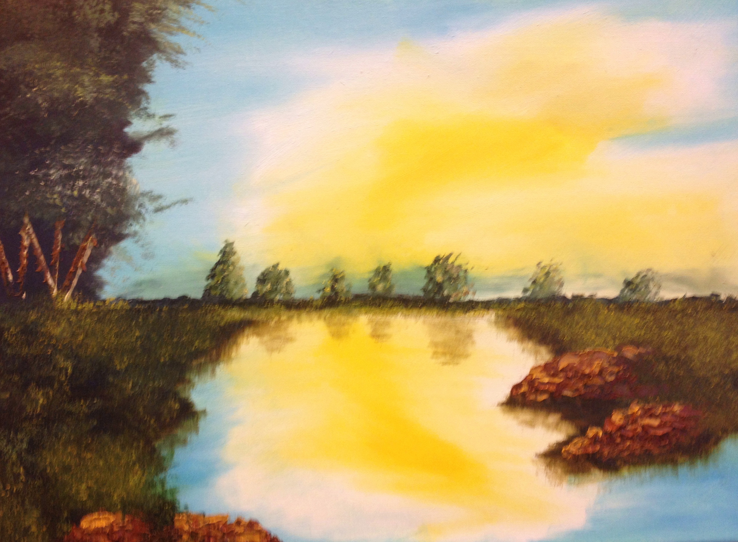 Bob Ross vertoonde zijn schilderskunsten vroeger op TV. Het ging snel en mooi. Wij mochten dit uit proberen en dit was het resultaat