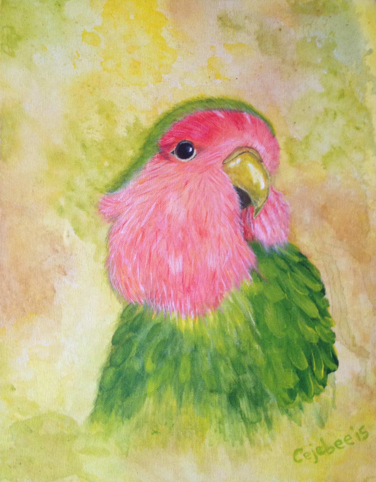 Deze agapornis (dwergpapegaai) is ook los geschilderd, maar veel realistischer, vind ik. Deze vogel is mooi geworden en het schilderij hangt in mijn 'atelier'.