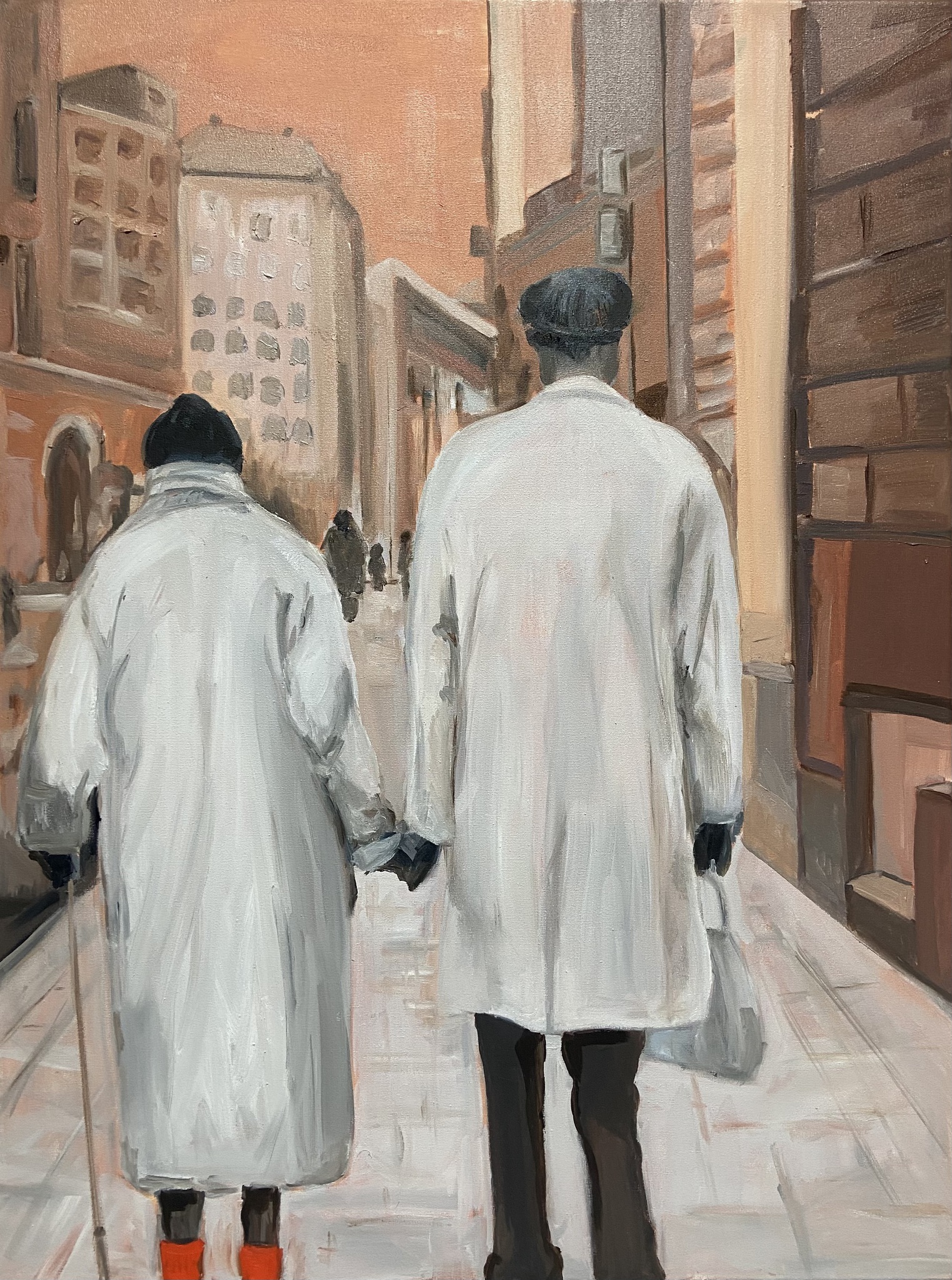 Ouder echtpaar in stedelijke omgeving. Zij draagt rode laarsjes.