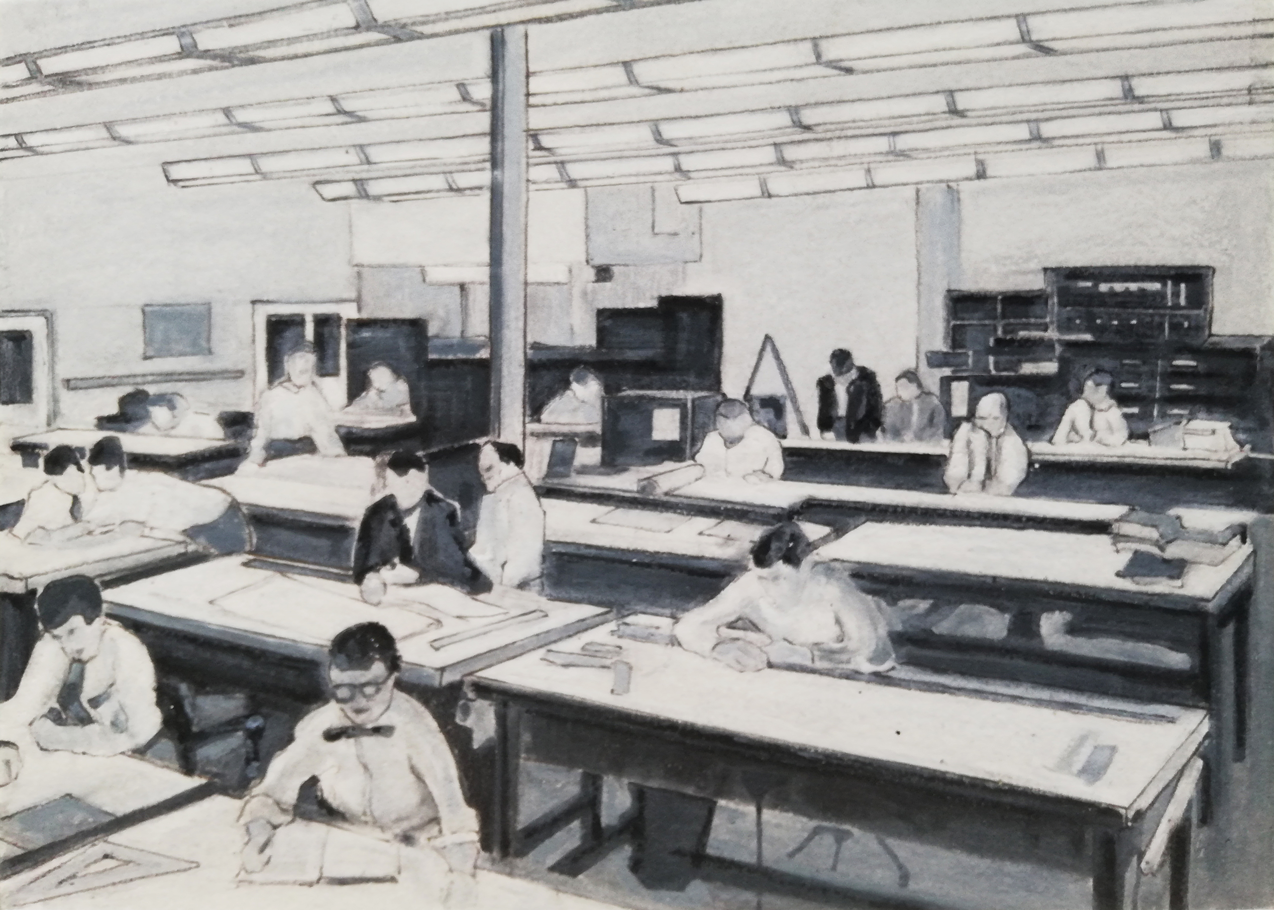 Een groep architecten en ontwerpers, aan het eind van de twintigste eeuw in een anoniem kantoor. Onderdeel van de serie "the powers that be".