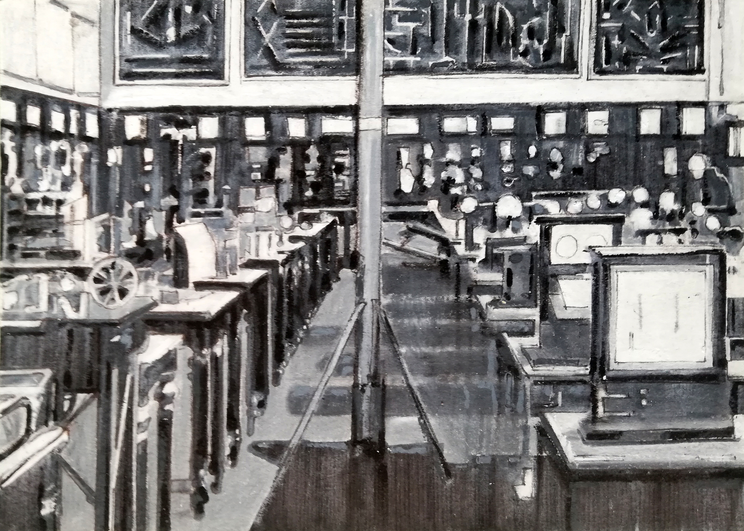 Tekening gebaseerd op een interieurfoto van het Mundaneum, een informatiearchief ontworpen door Paul Otlet en het begin va het internet.