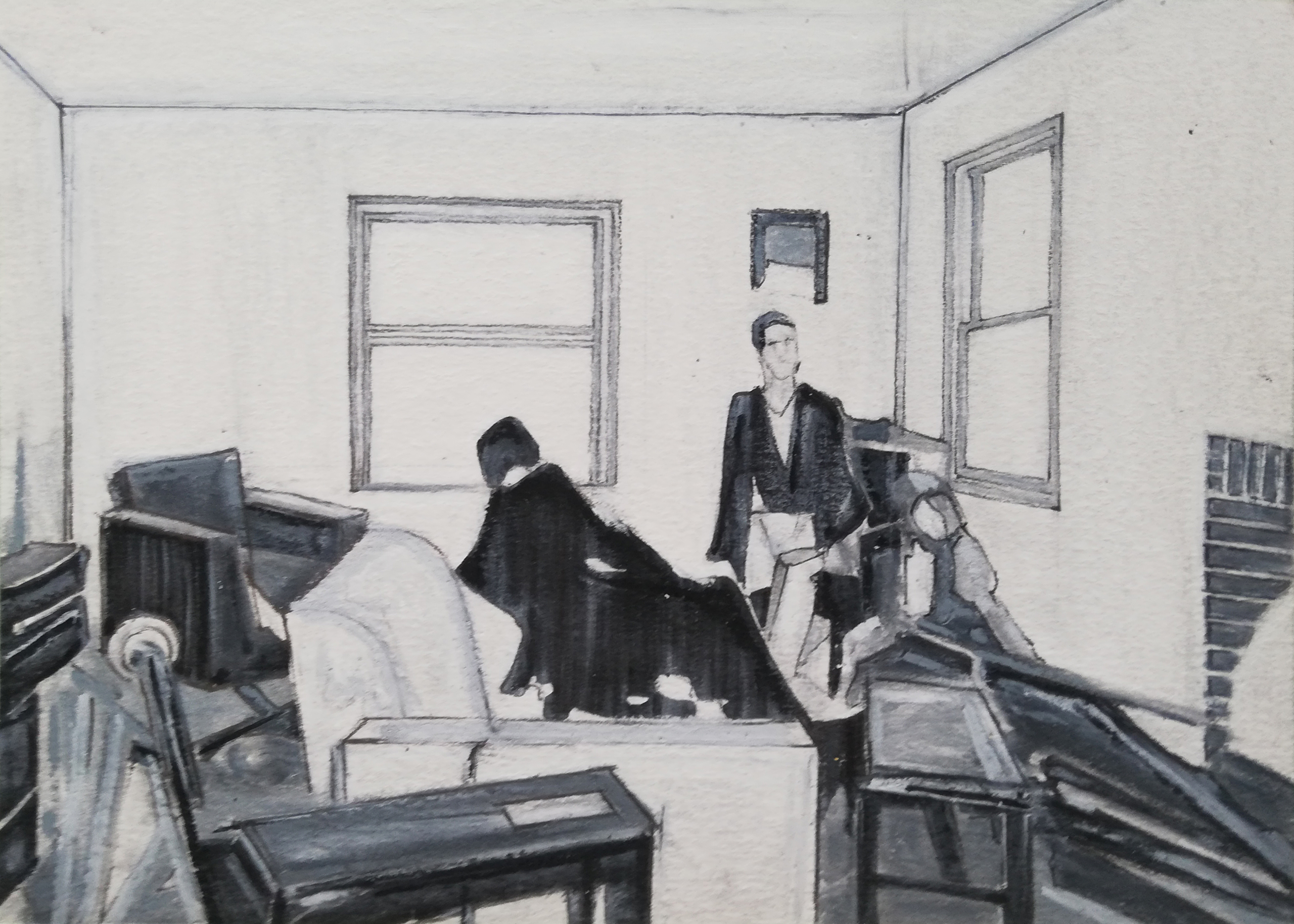 Tekening gebaseerd op een film still van de film "The house in the middle" uit 1954. Er wordt een interieur met crash test dummy's nagebouwd in de woestijn nabij een nucleaure test locatie, om de impact van een nucleaire explosie te onderzoeken.
