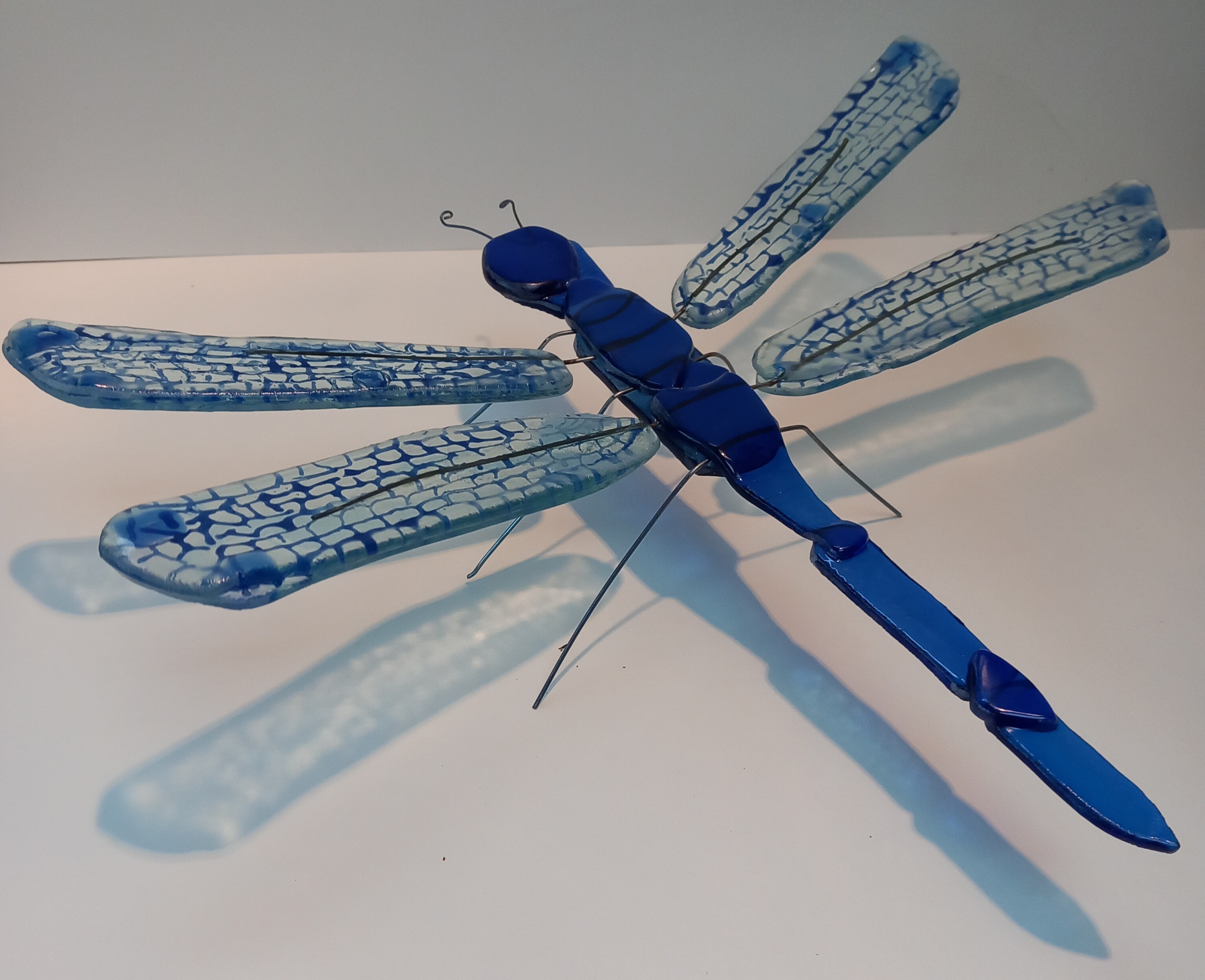 Deze subtiele libelle is geheel gemaakt van gerecycled glas. Op de vleugels is een tekening te zien van de prachtige libellevleugel-structuur. Het insect staat op 6 pootjes van canthaldraad.
