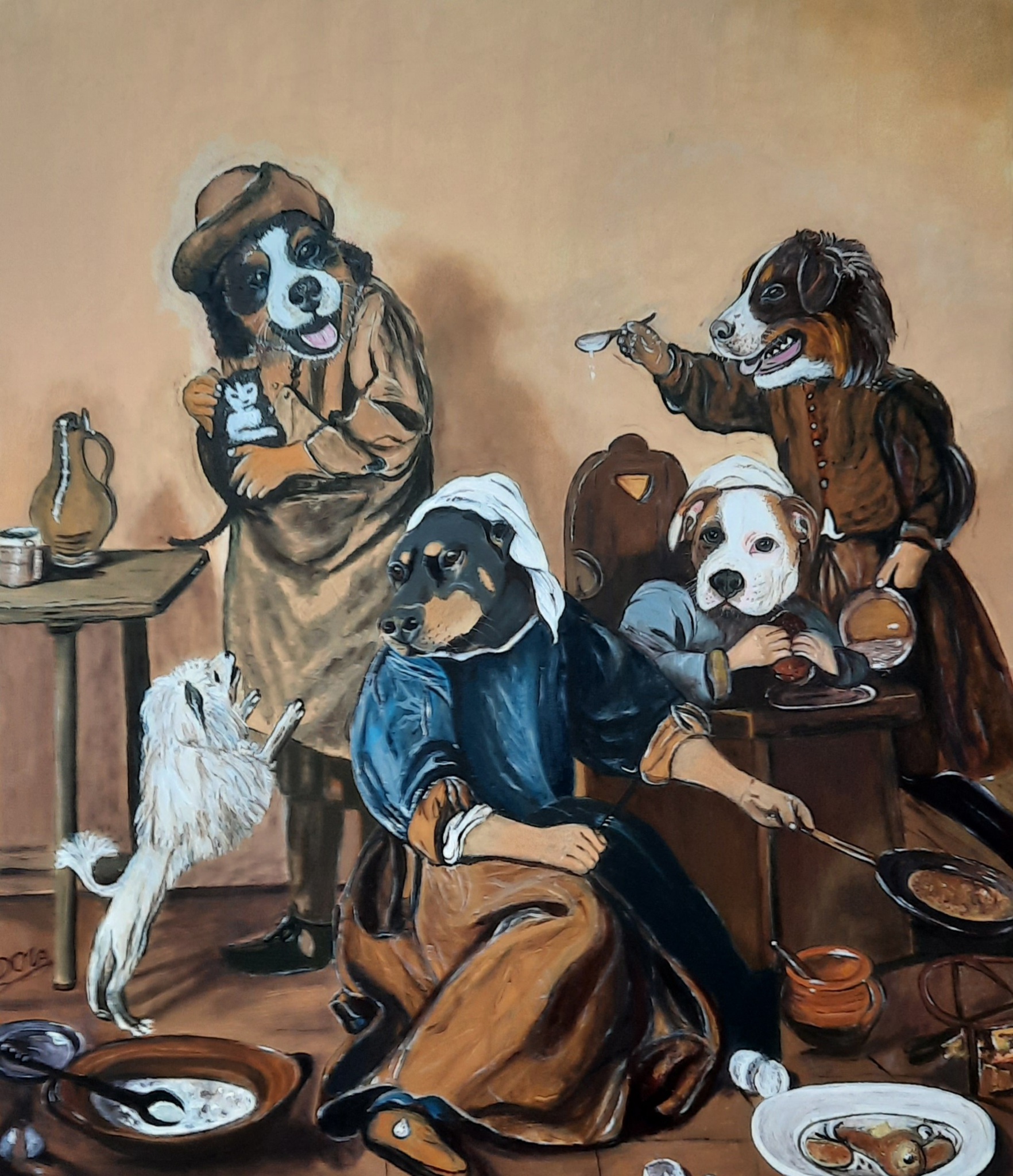Ik ben een groot fan van Jan Steen, ik houdt van zijn humoristische schilderstijl . Kinderen bakken pannenkoeken is met een knipoog gemaakt naar het schilderij van Jan Steen.