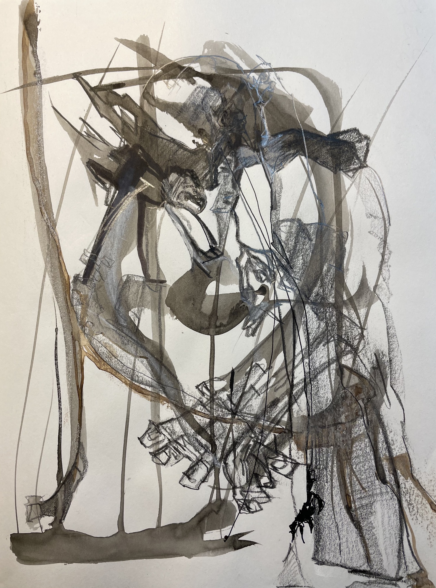 Vloeibaar houtskool, Bister, ArtGraf krijt, potlood, inkt op schetspapier.