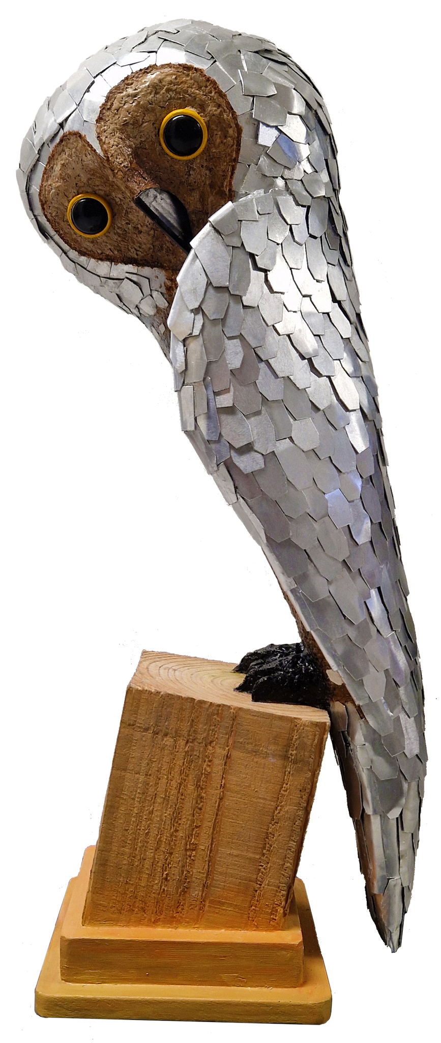 Uil vervaardigd van papier-mache en beplakt met talloze aluminium plaatjes
