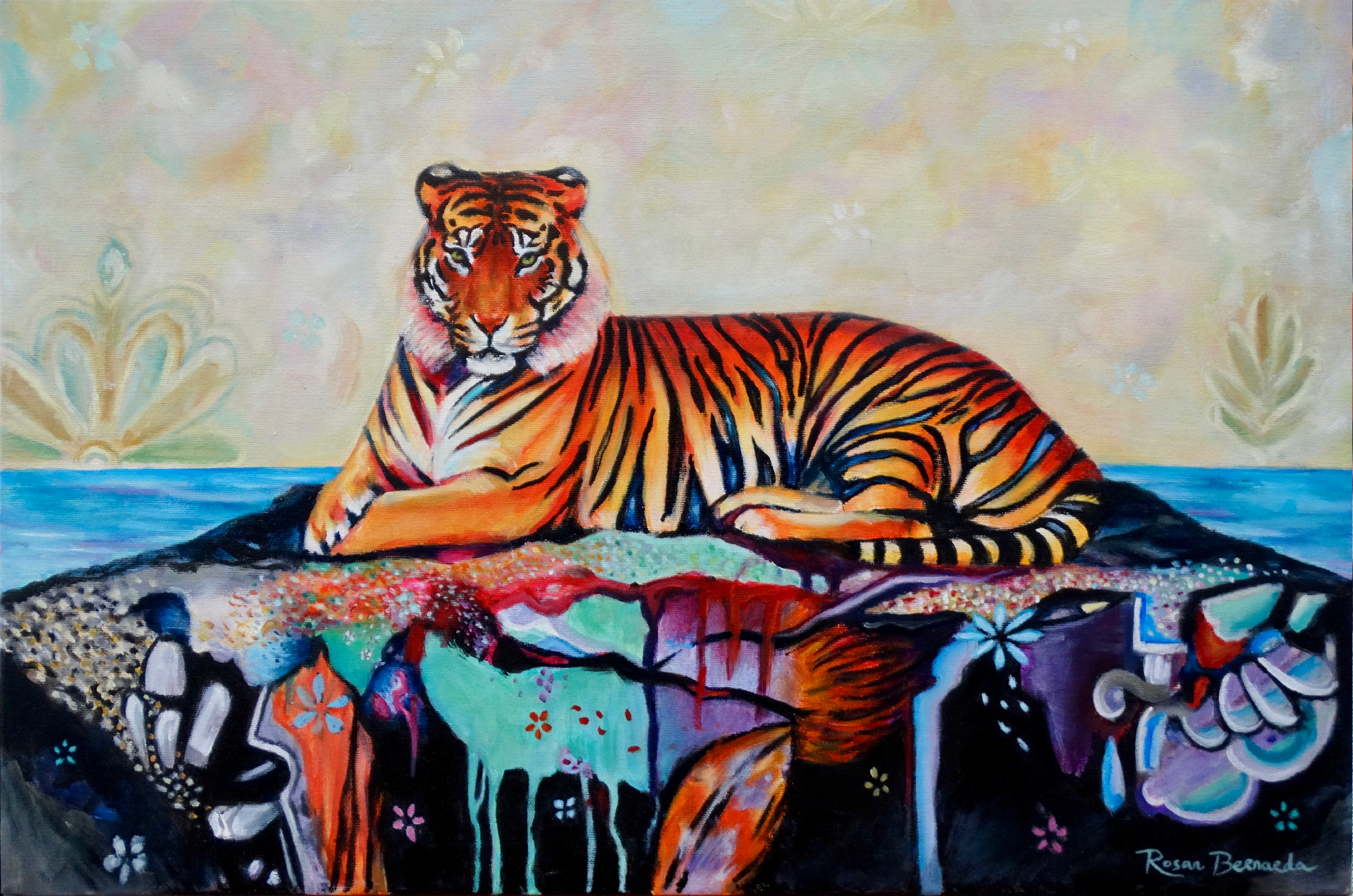 Ontdek de diepte van 'Patience', een mixed media kunstwerk van 40 x 60 cm dat het doek overstijgt. Laat je onderdompelen in de stille kracht van een tijger die rust op een rots, omringd door water en een uitgestrekte lucht. De abstracte lagen binnen de rots weerspiegelen het ingewikkelde tapijt van menselijke emoties, ons eraan herinnerend dat onder het oppervlak we allemaal lagen van geluk en verdriet dragen. De titel 'Patience' dient als een baken en nodigt uit tot reflectie over de veerkrachtige kalmte binnenin ons terwijl we door de complexiteiten van het leven navigeren.