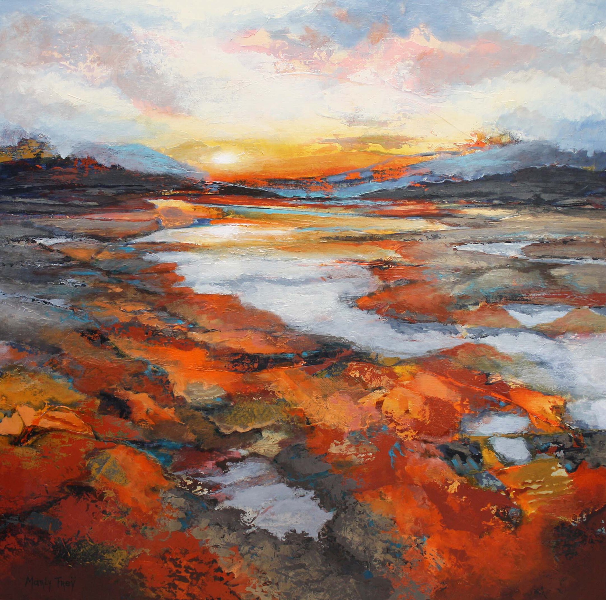 Marly Freij maakt grote kleurrijke, maar ook meer ingetogen schilderijen in gemengde techniek, met name sferische landschappen en abstracte composities