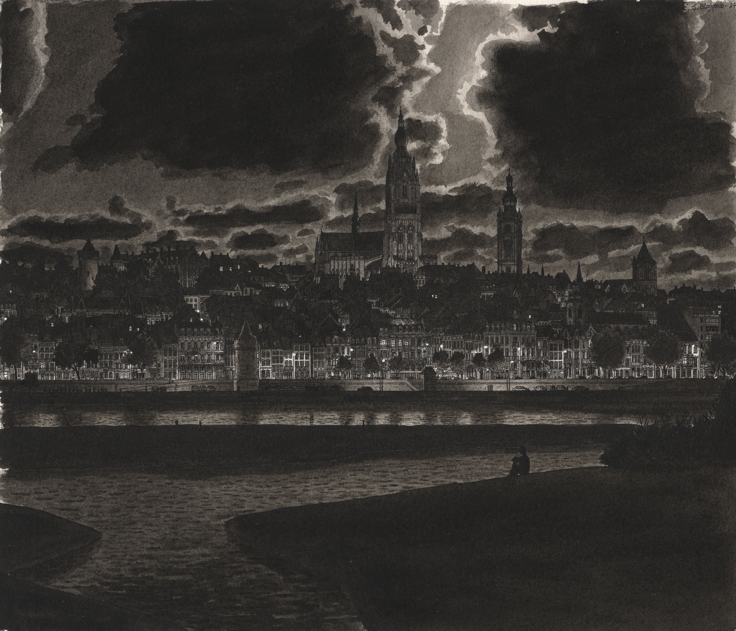 Een denkbeeldige stad op een zomeravond met de heldere volle maan deels verduisterd door omvangrijke onweerswolken. Deze architectuur doet denken aan Maastricht of Luik.