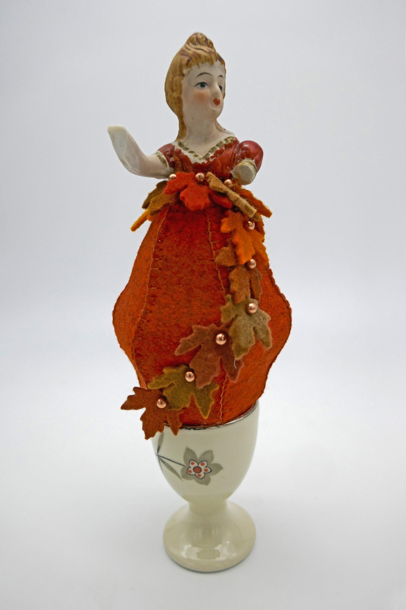 Deels handgeverfd wol vilt, keramiek, borduurzijde, foam, spelden.