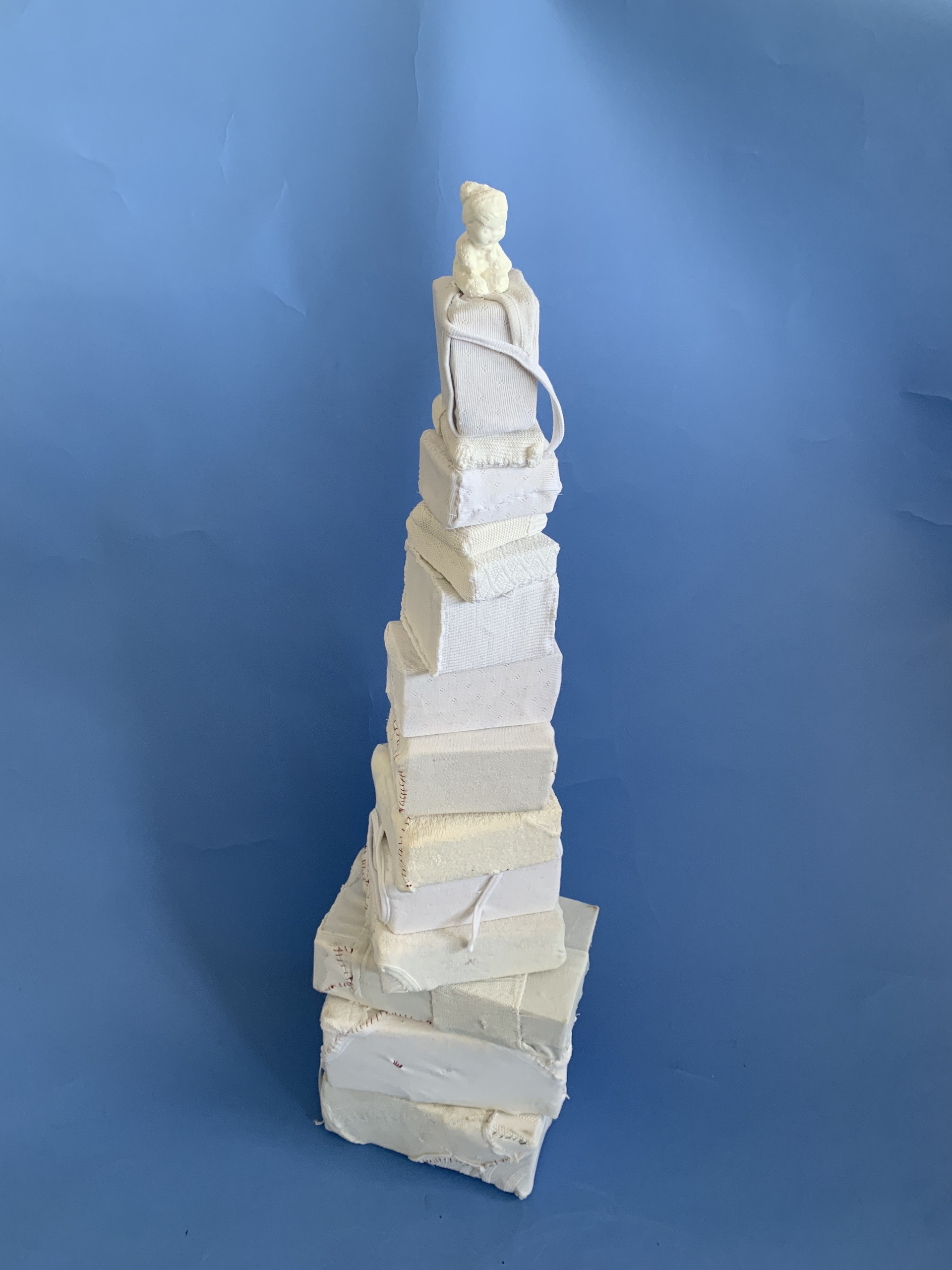 ruimtelijk werk gemaakt van dozen ingepakt in oude textiel, genaaid met vintage pop bovenop.