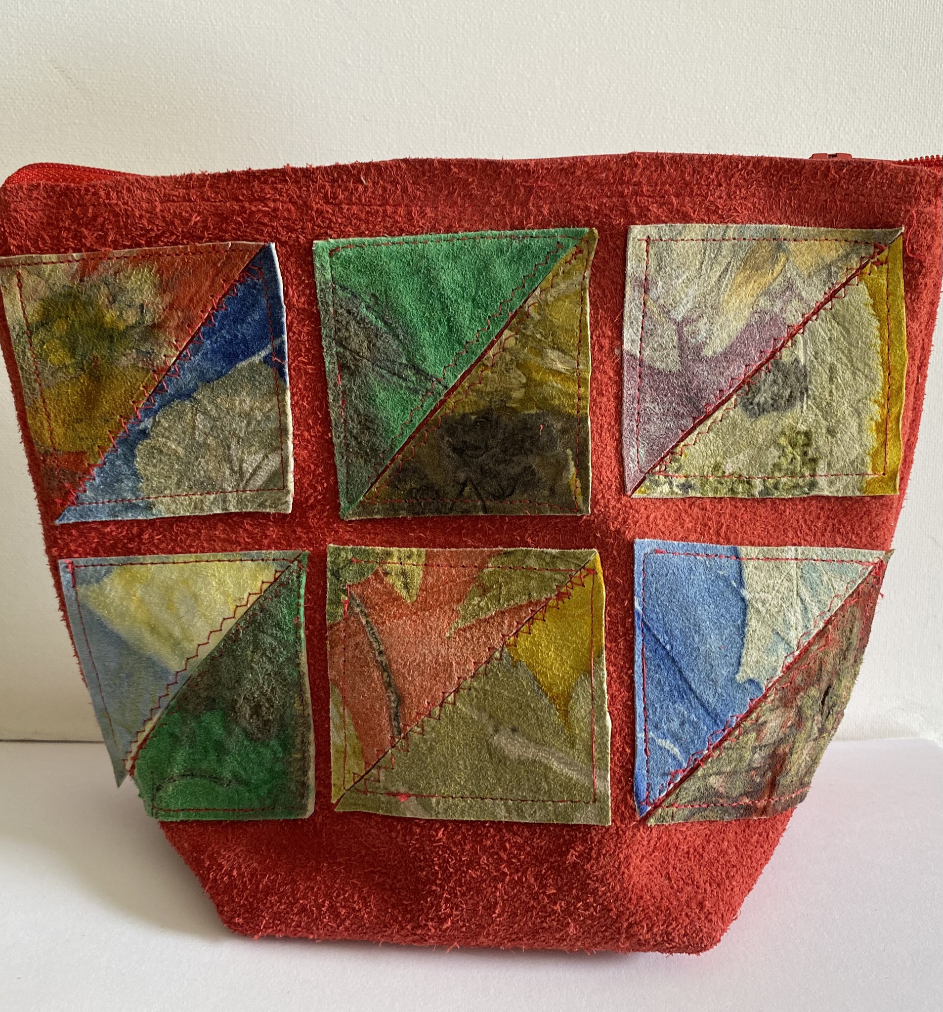 Deze toilettas heeft allerlei stukjes geprint geitenleer aan de voorkant. Het is gevoerd met een katoenen ecoprint. De toilettas sluit met een rits.