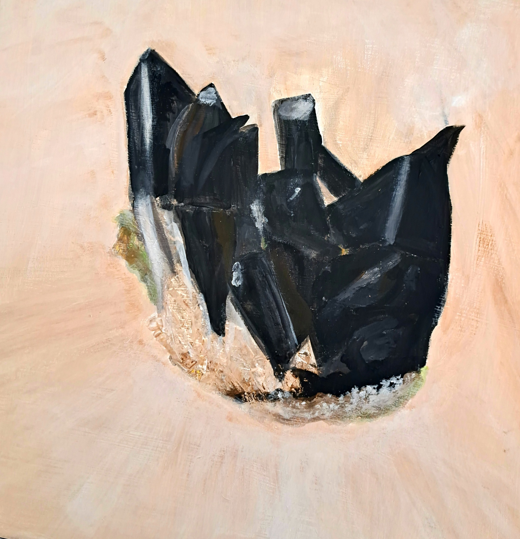 Een prachtige kunstwerk op doek the black crystal geschilderd met acrylverf De kleine lijkende steentje wat dus alleen geschilderd is, de rots de kleuren combinatie groen,bruin,zwart,wit,beetje geel