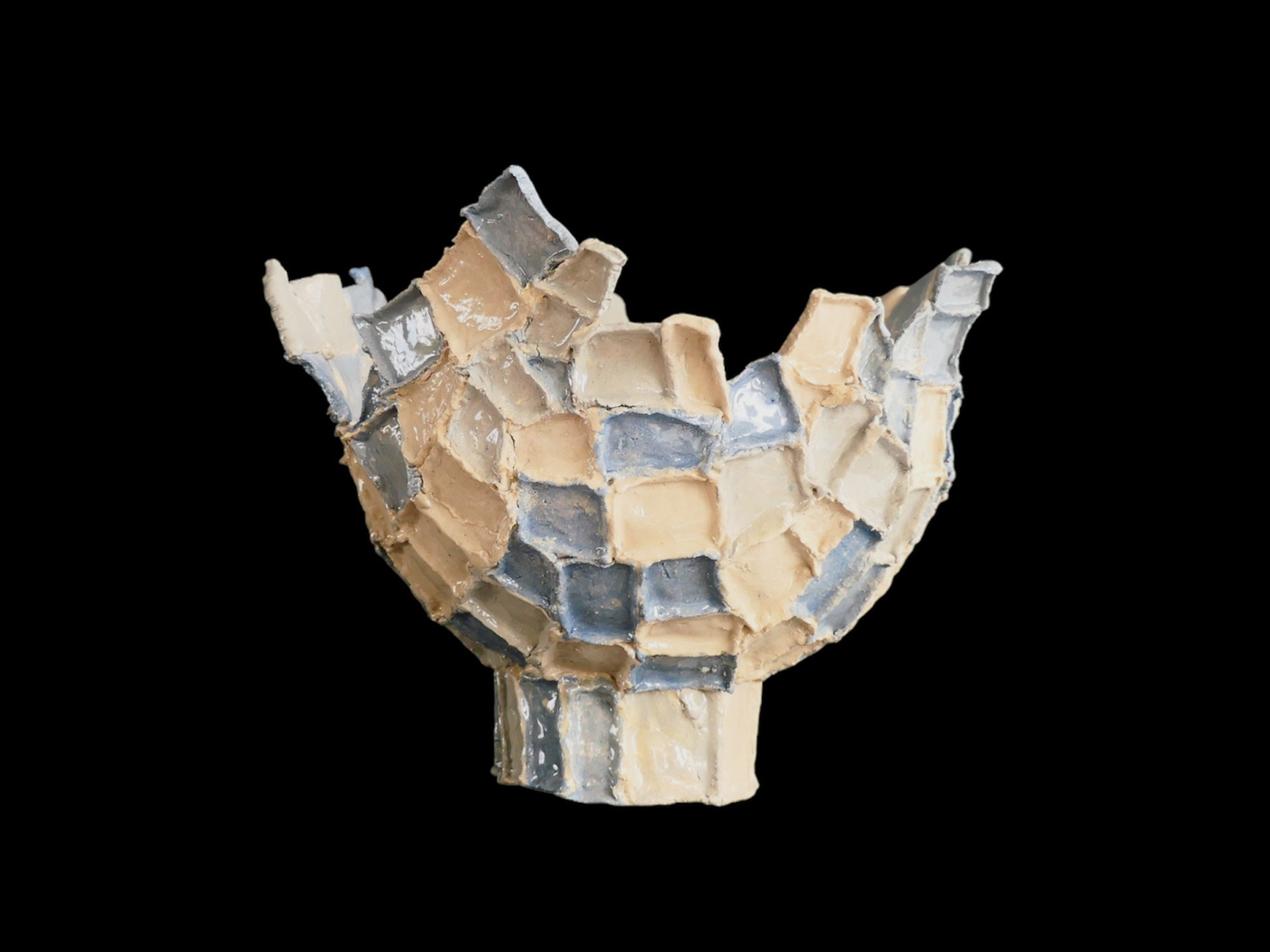 Kleine, dunne lapjes klei in wit-en blauwtinten zijn aan elkaar bevestigd tot een schaal op voet. De steengoedklei is zelf gekleurd met blauw pigment, waardoor de schaal lichter van gewicht is dan verwacht. Dit is de tweede schaal, maar deze is veel groter en heeft een andere kleur.