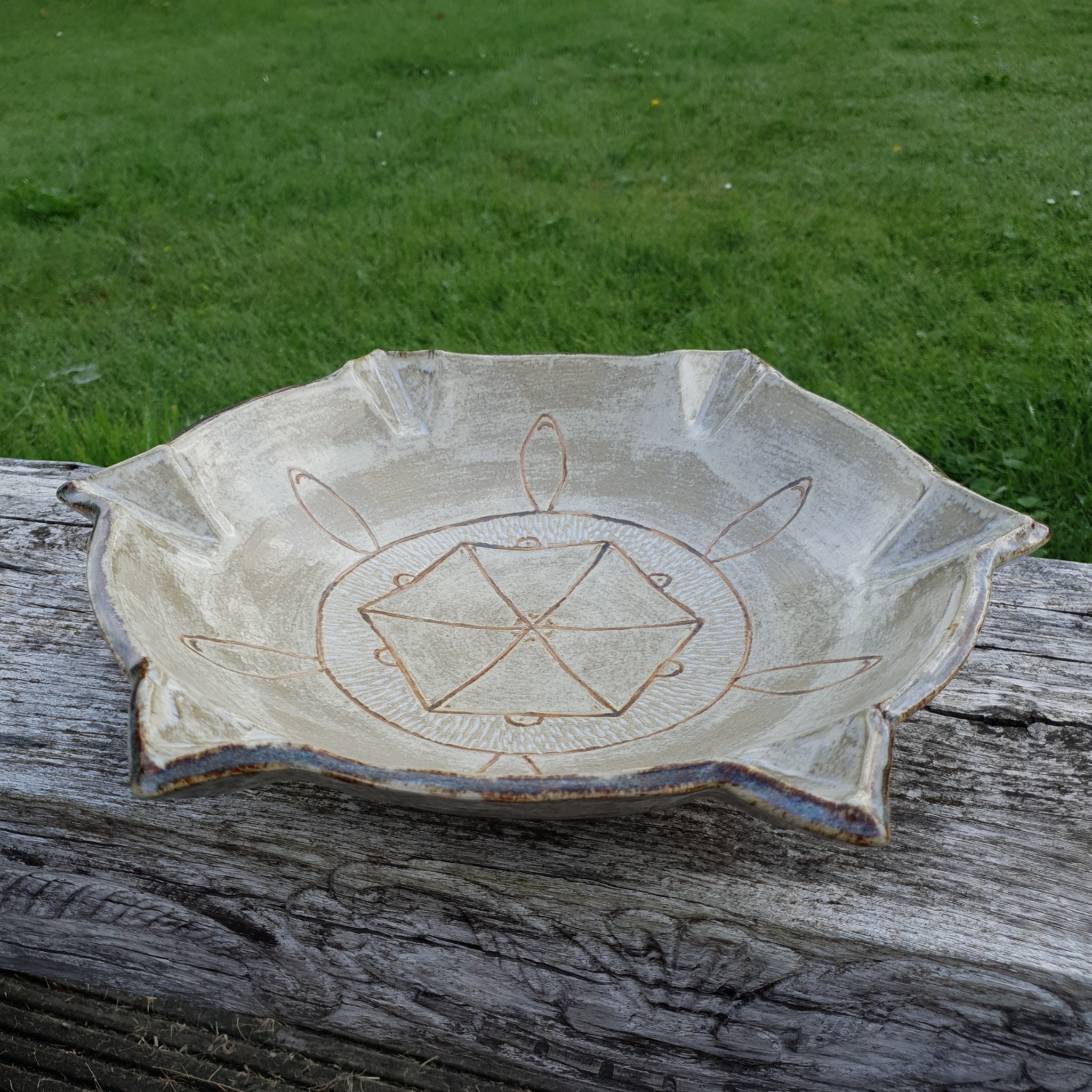 grote keramieken schaal, gebakken op steengoed temperatuur, kleur beige/grijs met bruintinten, met uitkervingen