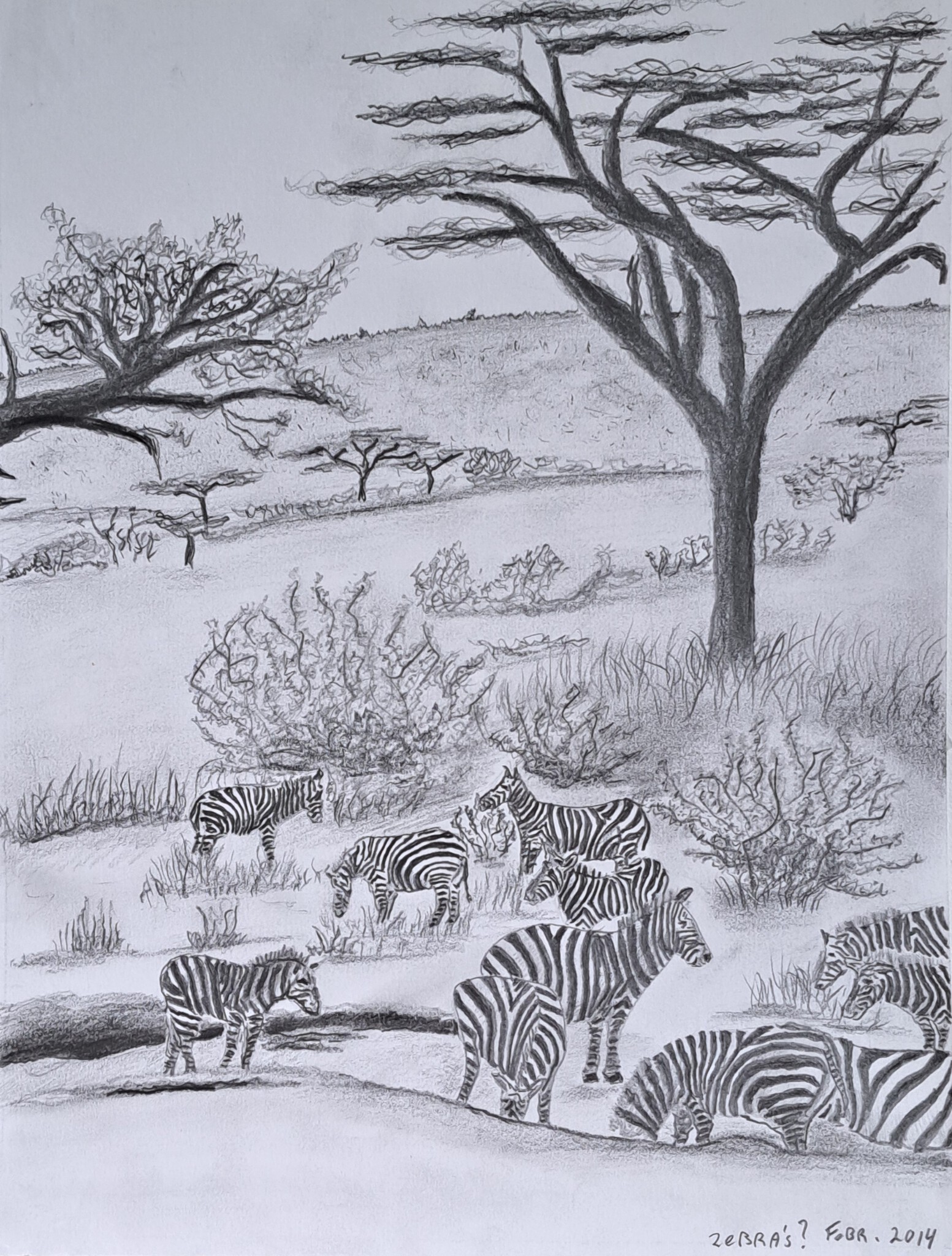 Savanne met zebra's. Om een tekening van de oorspronkelijk fraaie foto te maken bleek op den duur een oefening in geduld en een oog-oefening bovendien vanwege de in elkaar lopende strepen van de zebra's. Dit laatste nodigde bovendien uit om 'creatief' om te gaan met het aantal dieren. Ik tekende er uiteindelijk iets minder dan er op de foto werden getoond. Het gaat om de indruk!
