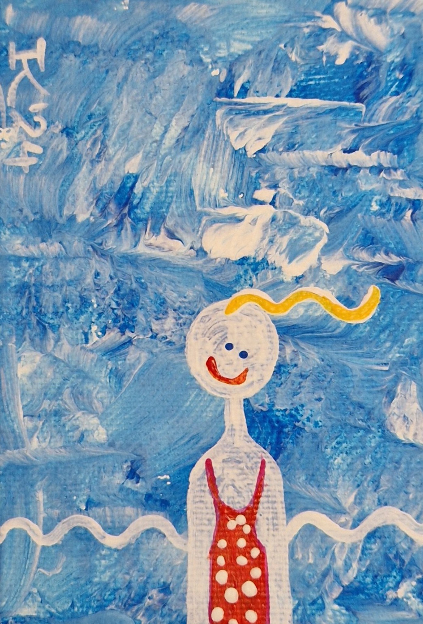 Minischilderijtje, 10 bij 7 cm, acrylverf op katoen, met ophanghaakje, Pictoright.