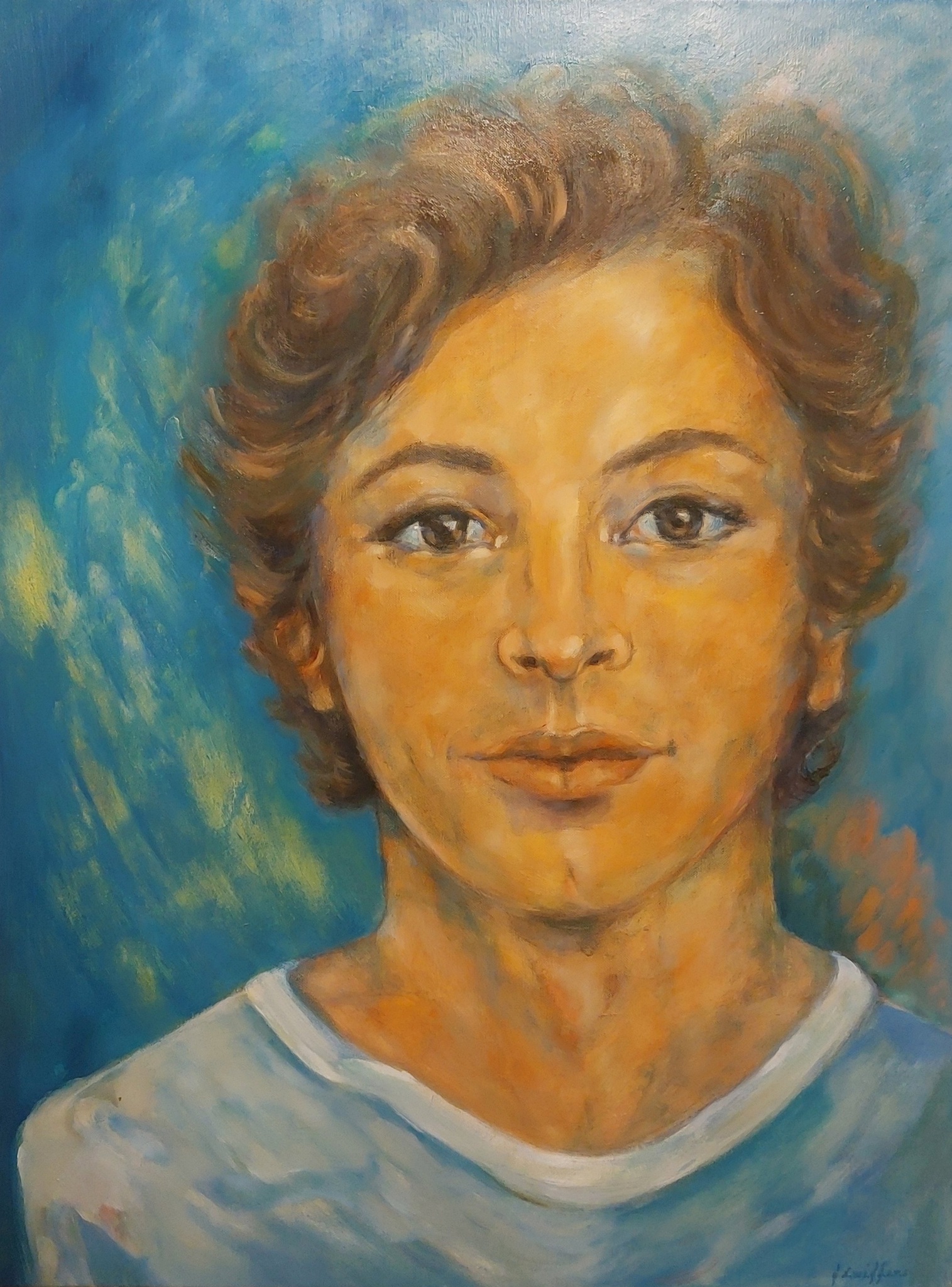 In dit portret ontmoet de kijker een blik die reikt voorbij het moment—open, helder, en tegelijk introspectief. De warme en koele kleurschakeringen weerspiegelen een innerlijke dialoog tussen afstand en nabijheid. Het werk nodigt uit tot verstilling, tot het zoeken van herkenning in het onbekende.
