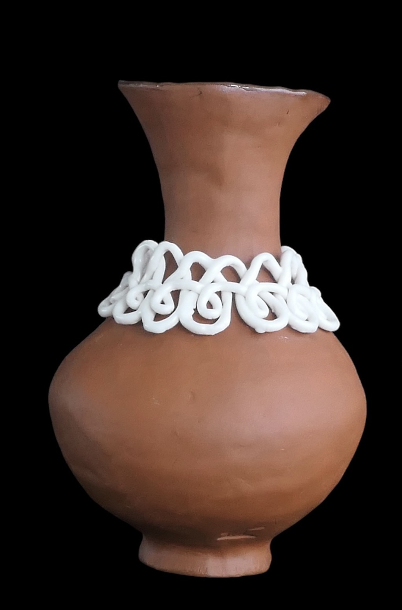 Het vaasje is handgevormd van terracottakleurige klei en voorzien van een kanten rand gemaakt van papier-porseleinklei. Daarna is het gebakken op steengoedtemperatuur en voorzien van een transparant glazuur aan de binnenkant van het vaasje en op het kant.