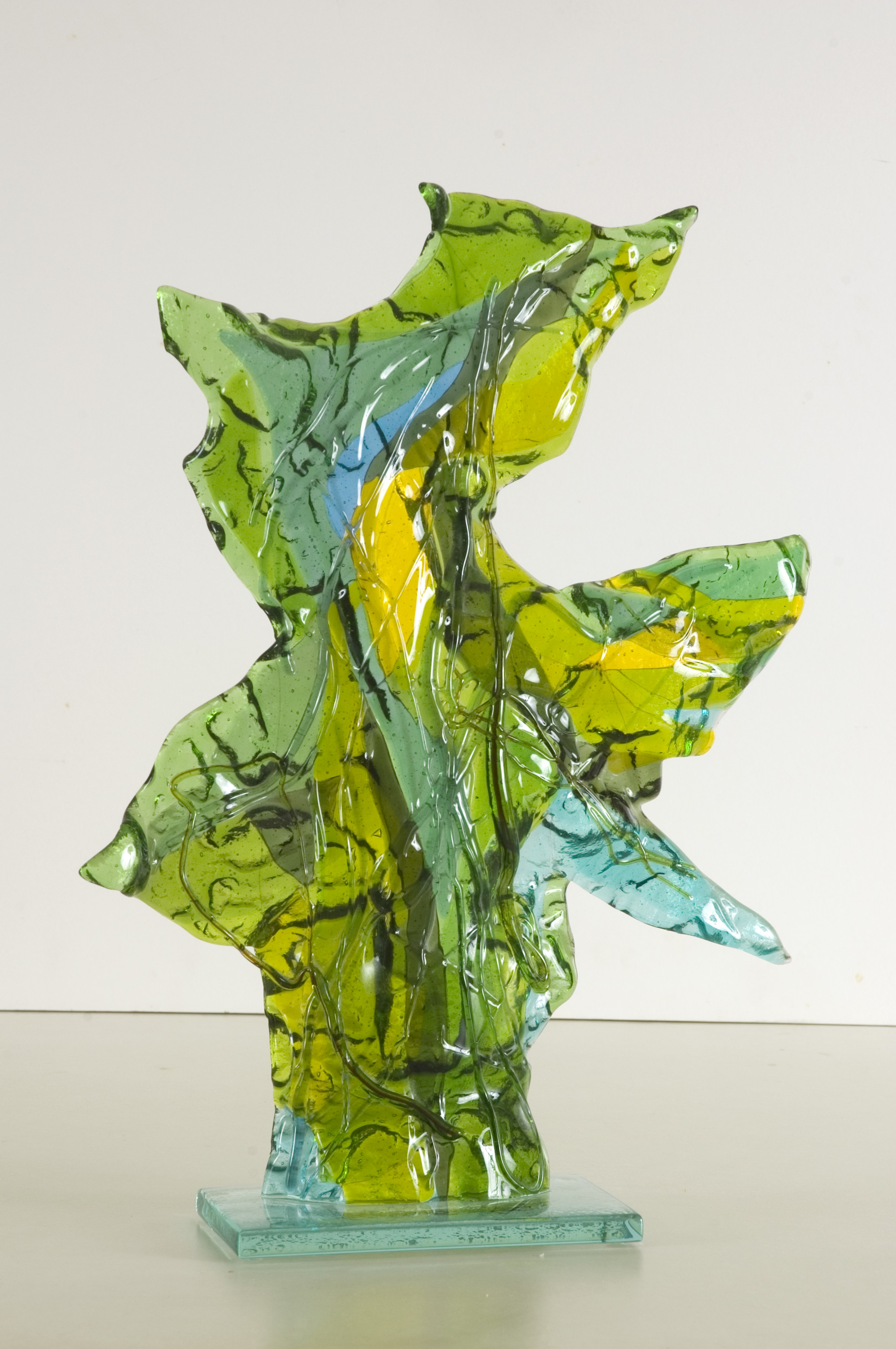 abstracte glaskunst, een sculptuur in de glas-fusing techniek. Kleurig beeld, met veel groen-tinten. Te koop. .