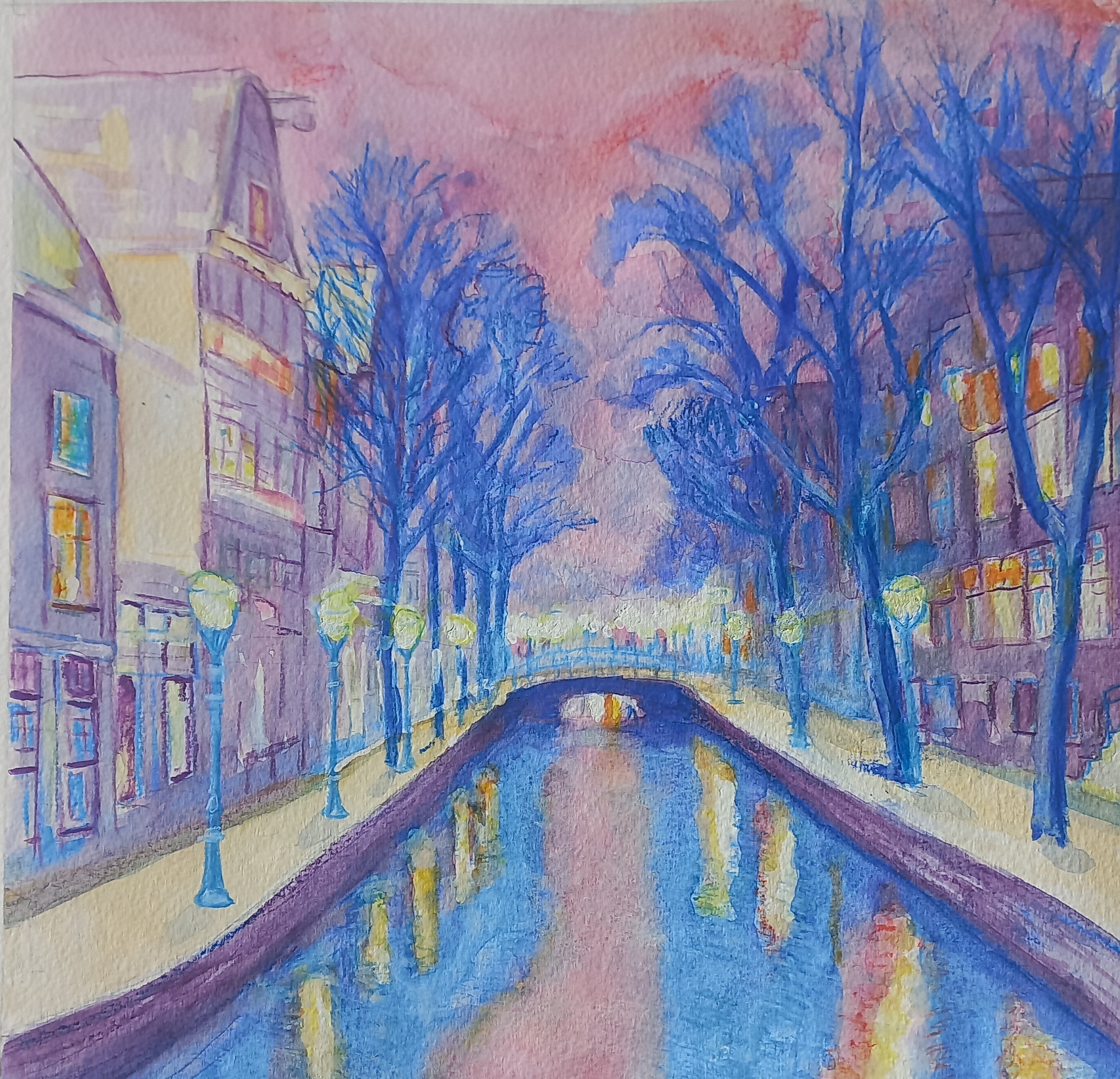 Gracht met bomen, impressie op papier