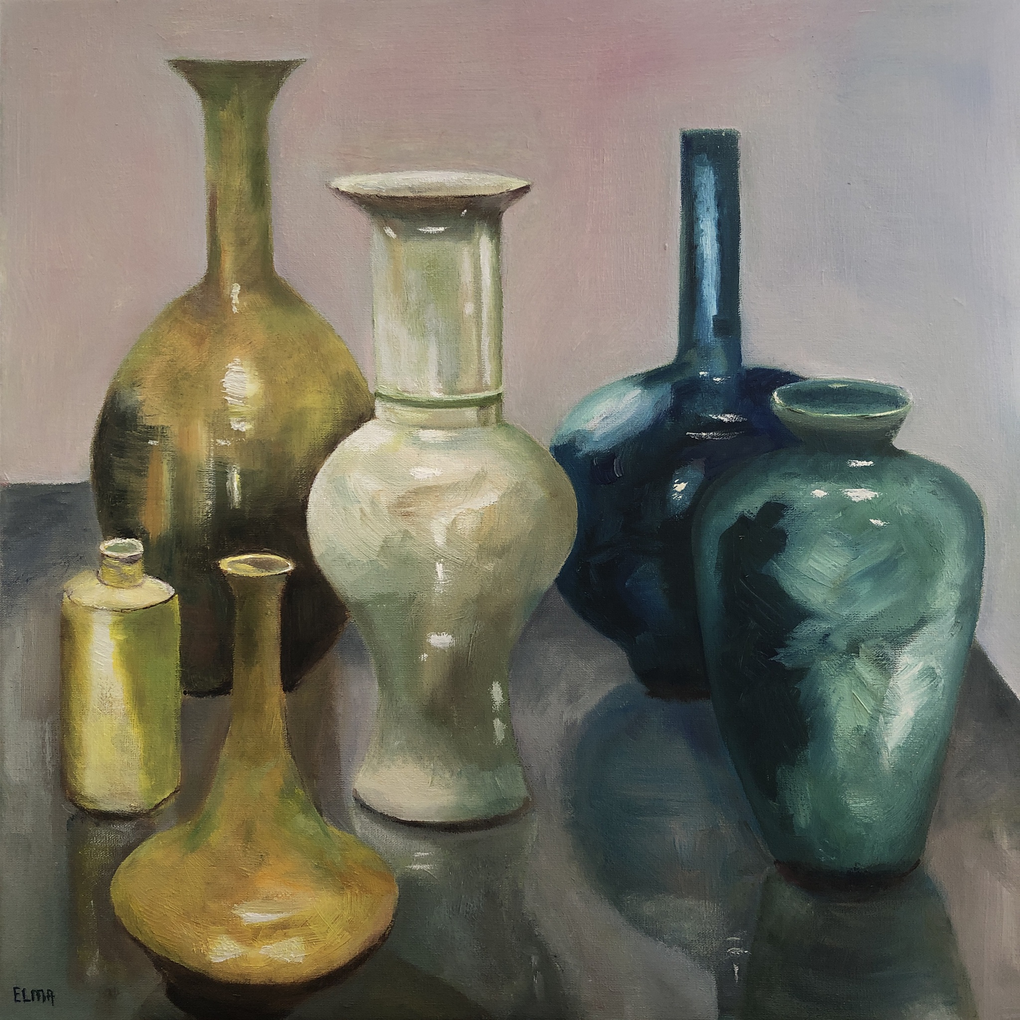 Vazen uit het museum samengebracht in wit, geel, blauw en groen in olieverf
