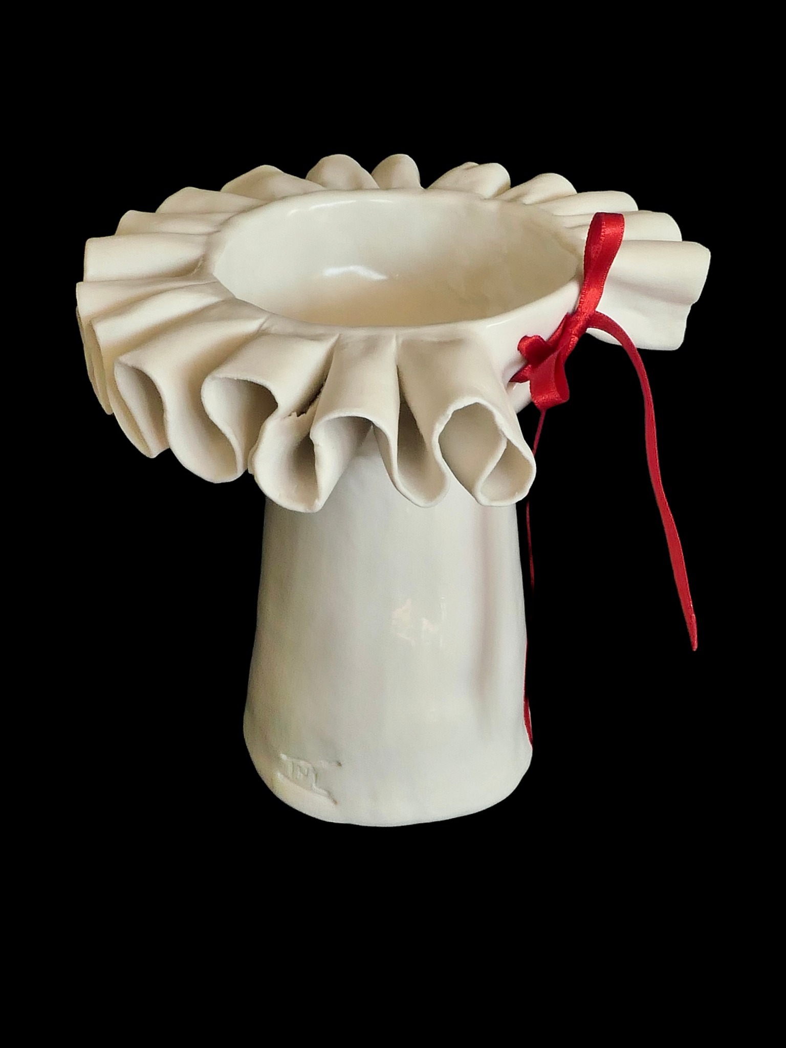 Handgevormd schaaltje op poot met een Lubbenkragenrand van porselein. Enkele jaren geleden nam ik deel aan de Gorinchemse expositie 'Middeleeuwen Nu', waar ik een aantal middeleeuwse molensteenkragen van aardewerk heb gemaakt. Inmiddels heb ik meerdere porseleinen schalen met een molensteenkragenrand vervaardigd en borduur ik verder op dit idee, waardoor er diverse varianten ontstaan. Molenstenenkragen hebben diverse namen oa Lubbenkraag. Het rode lint kan natuurlijk vervangen worden door een andere kleur.