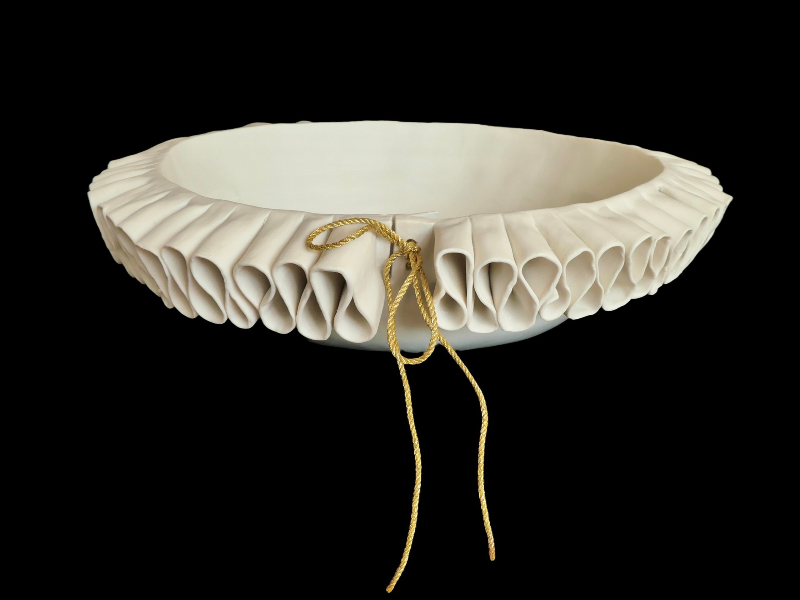 Handgevormd schaal met een Molensteenkragenrand van porselein en een gouden koord die de kraag sluit. Enkele jaren geleden nam ik deel aan de Gorinchemse expositie 'Middeleeuwen Nu', waar ik een aantal middeleeuwse molensteenkragen van aardewerk heb gemaakt. Inmiddels heb ik meerdere porseleinen schalen met een molensteenkragenrand vervaardigd en borduur ik verder op dit idee, waardoor er diverse varianten ontstaan. Molenstenenkragen hebben diverse namen oa Lubbenkraag, Pijpkraag en Plooikraag. Het gouden koord kan natuurlijk vervangen worden door een ander koord of lint.