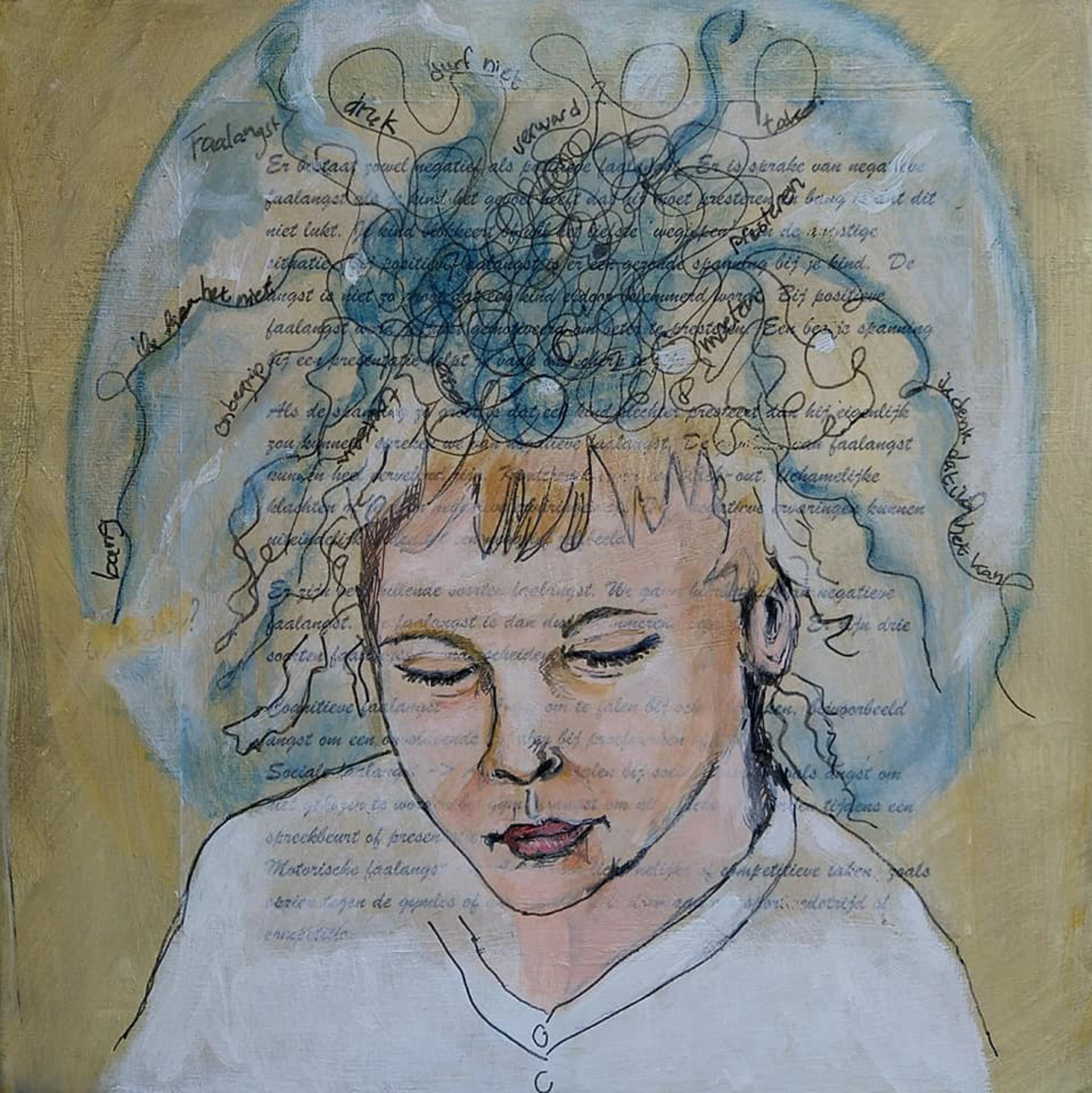 Een kunstdruk van een schilderij uit de serie kwetsbaarheid van de mens.Het is een serie van 6 werken met tekst verwerkt in het schilderij. Elk werk vertelt een verhaal, waarmee ik de kijker wil raken en over na wil laten denken.