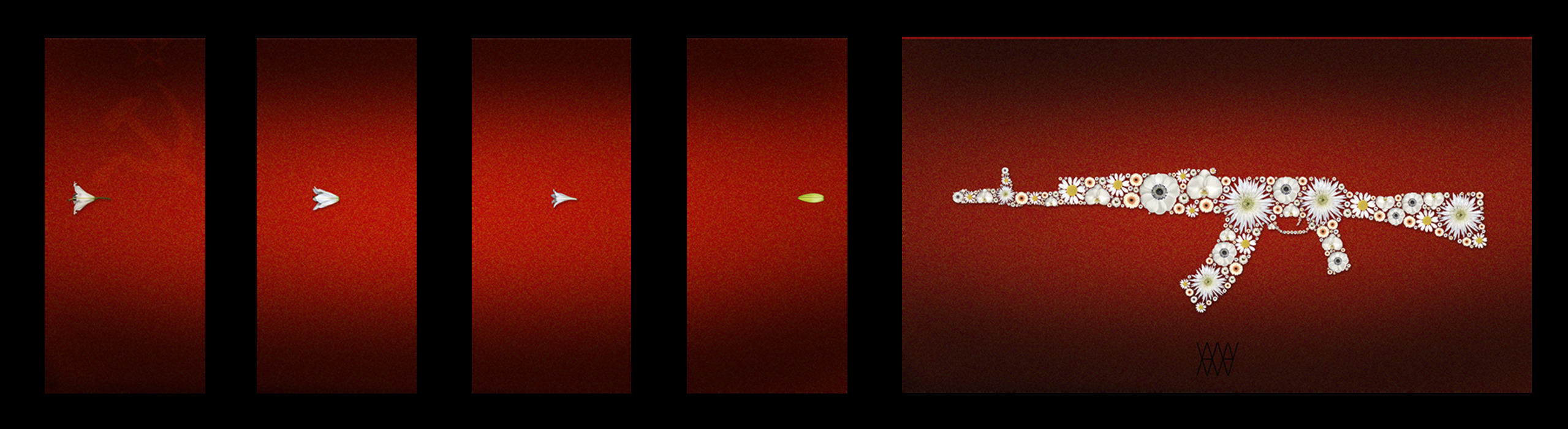 Mijn tegengeluid op de verheerlijking van het wapengekletter. Wereldleiders die niet voor elkaar willen onderdoen en ‘krachtige’ taal spreken. Kunstenaars die wapens tot esthetiek verheffen. Terroristen die hun onvrede met bommen uiten, bestrijd ik met bloemen. Met mooi en lief en vredig. Mijn bloemen vuren volautomatisch nog meer gevoelens van ‘open-je-hart’ de wereld in. Misschien wel zoals Kalashnikov dat zelf achteraf bedoeld heeft. Hij betuigde immers later zijn spijt voor het maken van dit doeltreffende wapen.