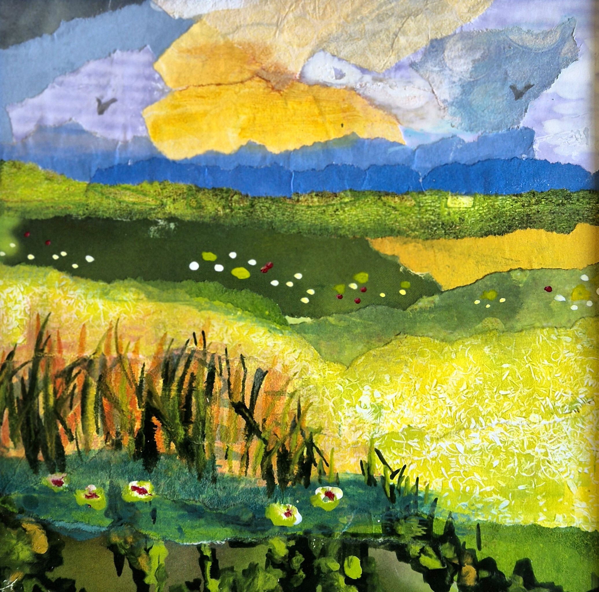 Een collage met een zomers landschap. Het werk wordt geleverd in een lijst met passe partout en is 32 x 32 cm totaal. Stuur mij een mail als je interesse hebt. margreetfineart@gmail.com